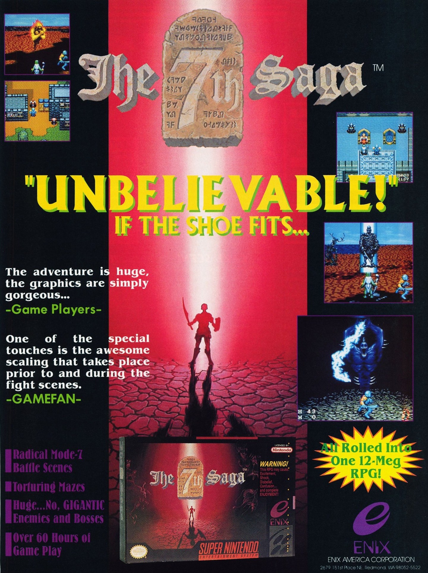 The Japanese turn-based RPG phenomenon was sweeping the globe during the early 90’s. Final Fantasy was flourishing along with Dragon Quest, and Chrono Trigger were in their prime. Despite these giants of the gaming and JRPG industry, a smaller game by the name of The 7th Saga would try its hand t rising to fame with some serious competition. When the game was released, the verdict was pretty straightforward: the combat was difficult and overwhelmingly tedious/bland in design, though the rest of the experience had its high points. The 7th Saga may not be a household name today, nor was it particularly groundbreaking or popular during its run, but presented an innovative experience in terms of story, character design, and some unique sound and graphical aspects too.