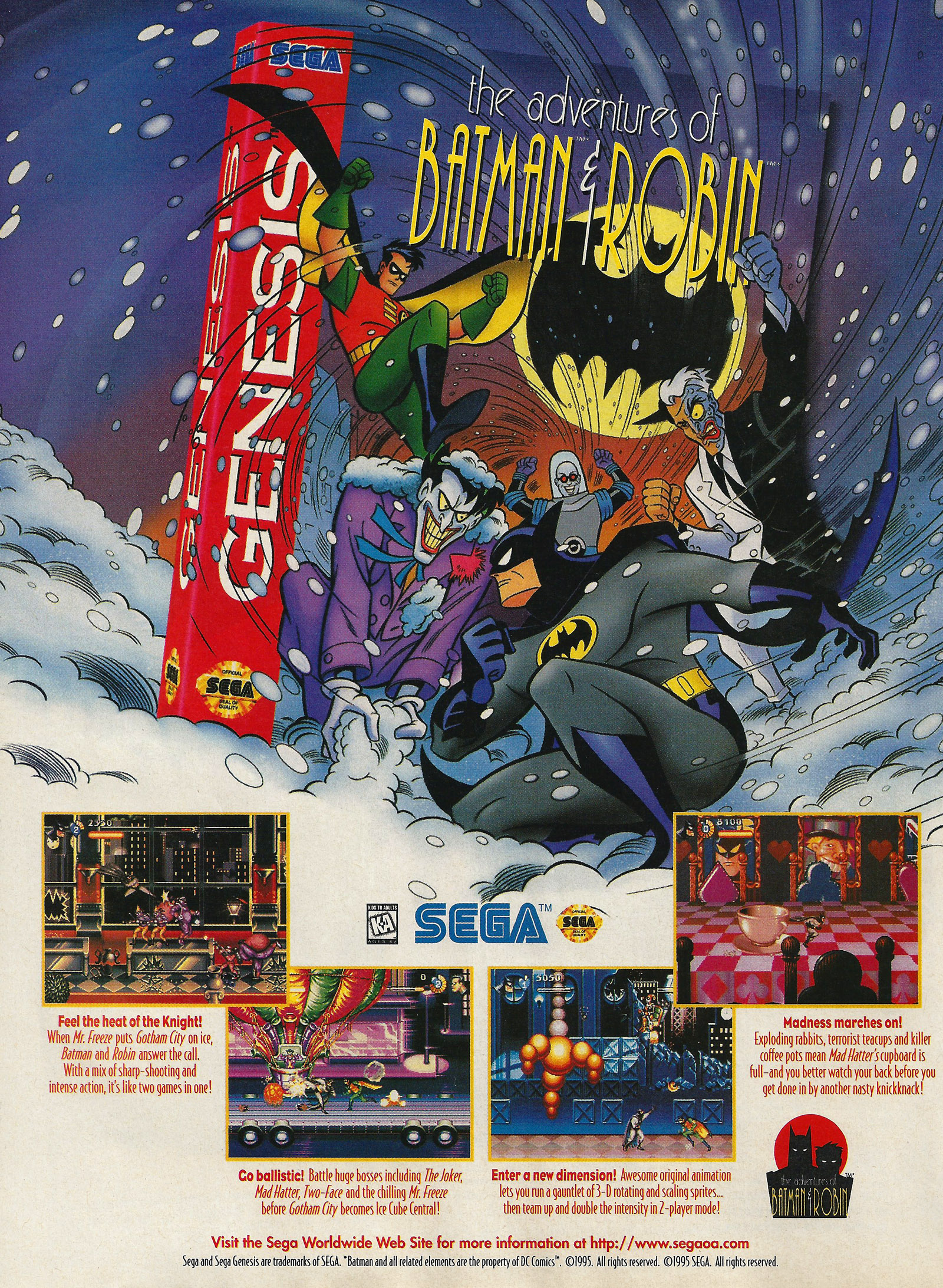 You play as Batman or Robin in four long levels, running after the Joker, Mr. Freeze, the Mad Hatter, and Two-Face. Each villain wants a piece of ol' pointy ears and his prepubescent pal.