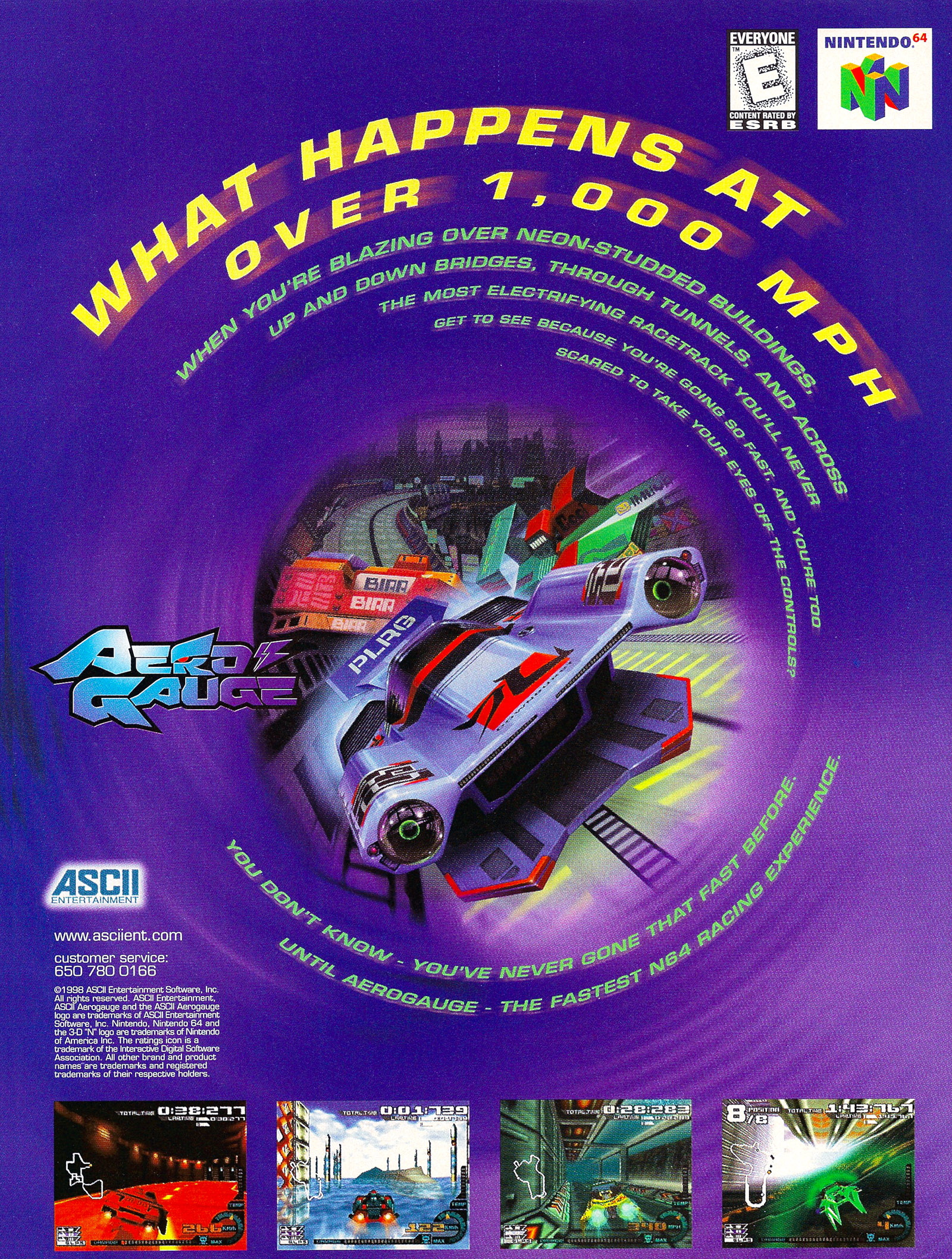 AeroGauge is cut from the same cloth as futuristic racers like WipeOut XL and Extreme-G. Unfortunately, it couldn't hold their jockstrap, so to speak. The fancy-looking flying cars are the highlight of the game. They consist of radically different designs, complete with moving flaps when you make turns. Also, they race on some neat courses, one of which spirals around an island then into an underwater tube. That's where the compliments end. Technically, AeroGauge is very lackluster. Although the tracks look good, the polygonal pop-up is very annoying--it's so extreme in places that it can mess you up by inconveniently popping things up in front of you at inopportune times. This adds a little frustration to a game that isn't too much fun to begin with. Even though you can fly and perform impromptu speed bursts, AeroGauge, for the most part, is a mundane racing game. Perhaps weapons or defensive countermeasures could have done a lot to make the races more interesting--there just isn't enough to do. One thing is certain, the horribly synthesized music sure doesn't help the dull mood of the game. I was forced to lower the volume and pop in my own CD. AeroGauge isn't a bad game, but it falls into the rapidly filling bucket of mediocre Nintendo 64 games that refuse to offer anything special to set them apart.