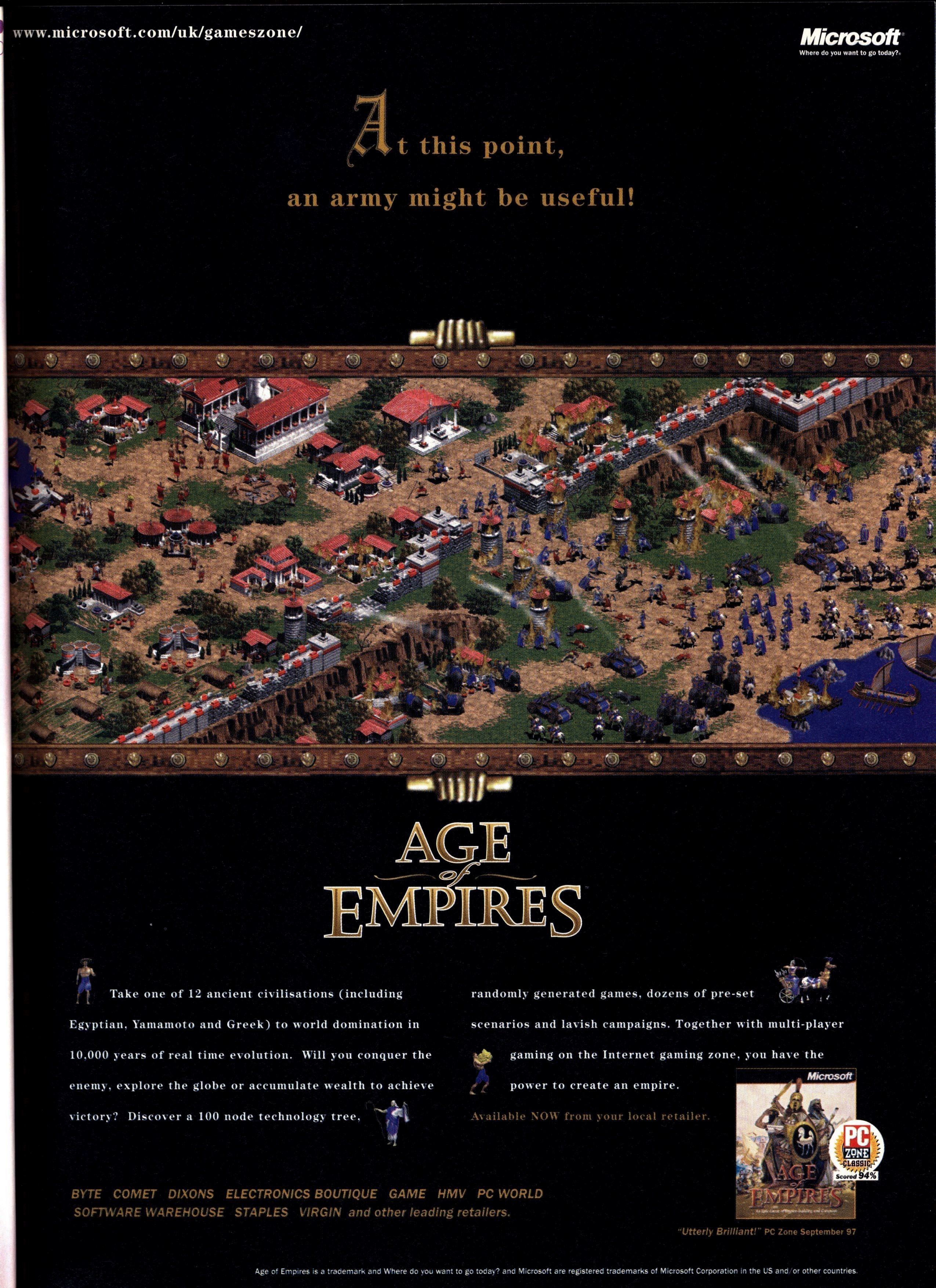 Становится все более очевидным, что на рынке появляется все меньше и меньше действительно качественно разработанных игр, особенно в категории стратегий в реальном времени. Похоже, что этот жанр стал жертвой любителей «быстрой наживы», которые породил целый ряд посредственных клонов серии Command & Conquer. Нынешние высокие требования к компьютерным играм могут сформировать у вас ошибочное суждение об RTS-игре от компании Microsoft, известной такими “импульсивными” продуктами как DOS 5.0 и Visual C ++. Но если по этой причине вы не ознакомитесь с проектом под названием Age of Empires, то это станет настоящей потерей. Это потрясающая игра - в год релиза она стала главным претендентом на звание Стратегической игры года, обогнав даже впечатляющие релизы Total Annihilation и Dark Reign.