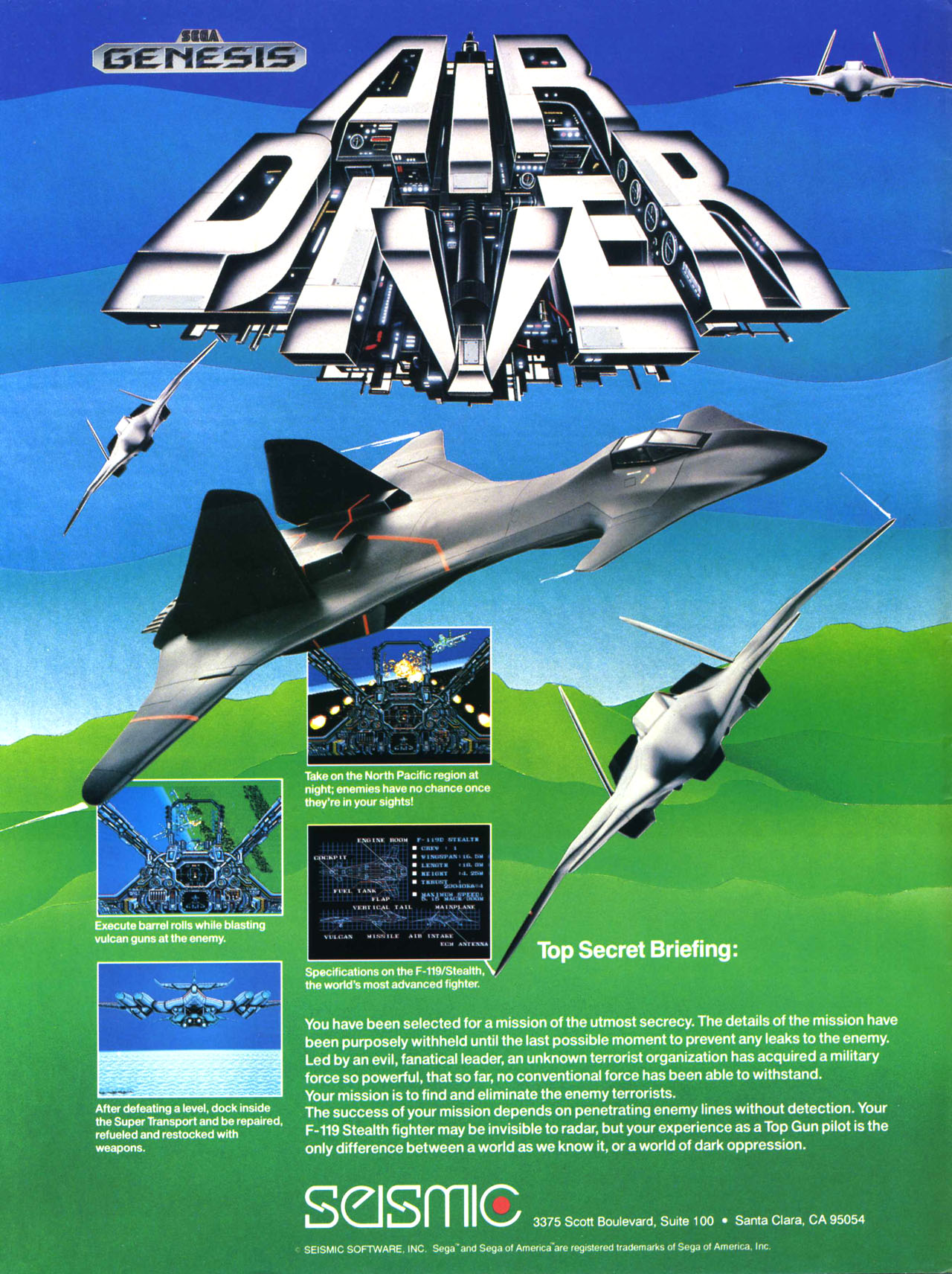 The first flight simulation game for the Genesis combines true flying realism with fast-paced arcade-style combat. Arm your Air Diver stealth fighter, review your battle plans, and take to the skies to make the clouds a friendlier place to live. Great graphics top off this unique cart.