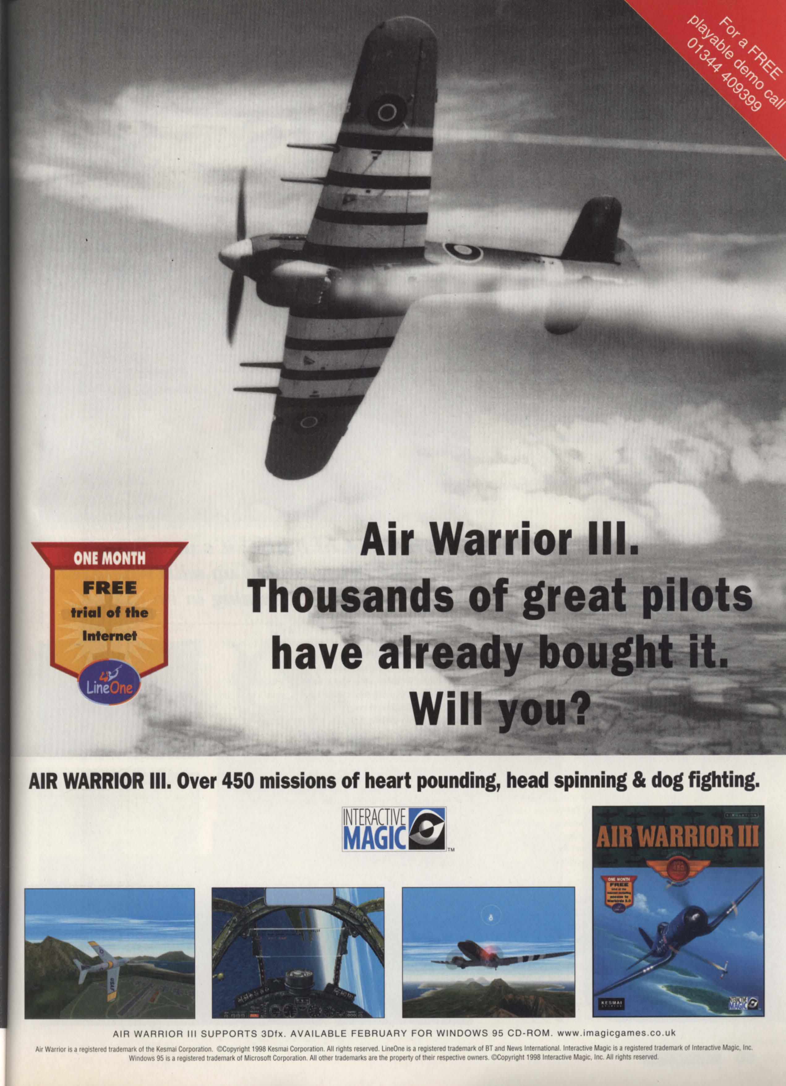 Long-time online pilots should all be aware of the history of Kesmai's Air Warrior series. Ever since the 1980s, they have been playing Air Warrior on online services such as GEnie, Delphi, America Online and now the Internet. Air Warrior has evolved from an online-only "front end" to a boxed version containing online and single-player missions and campaigns. Enter the latest installment: Air Warrior III . Air Warrior III contains an extremely authentic flight model, many planes to fly, and probably more missions than any other flight simulation money can buy. Air Warrior III is primarily a WWII aircraft simulation. That means no fire and forget missiles, no sophisticated radar systems, and no afterburners. Just plain and simple: head-to-head air combat at its best.