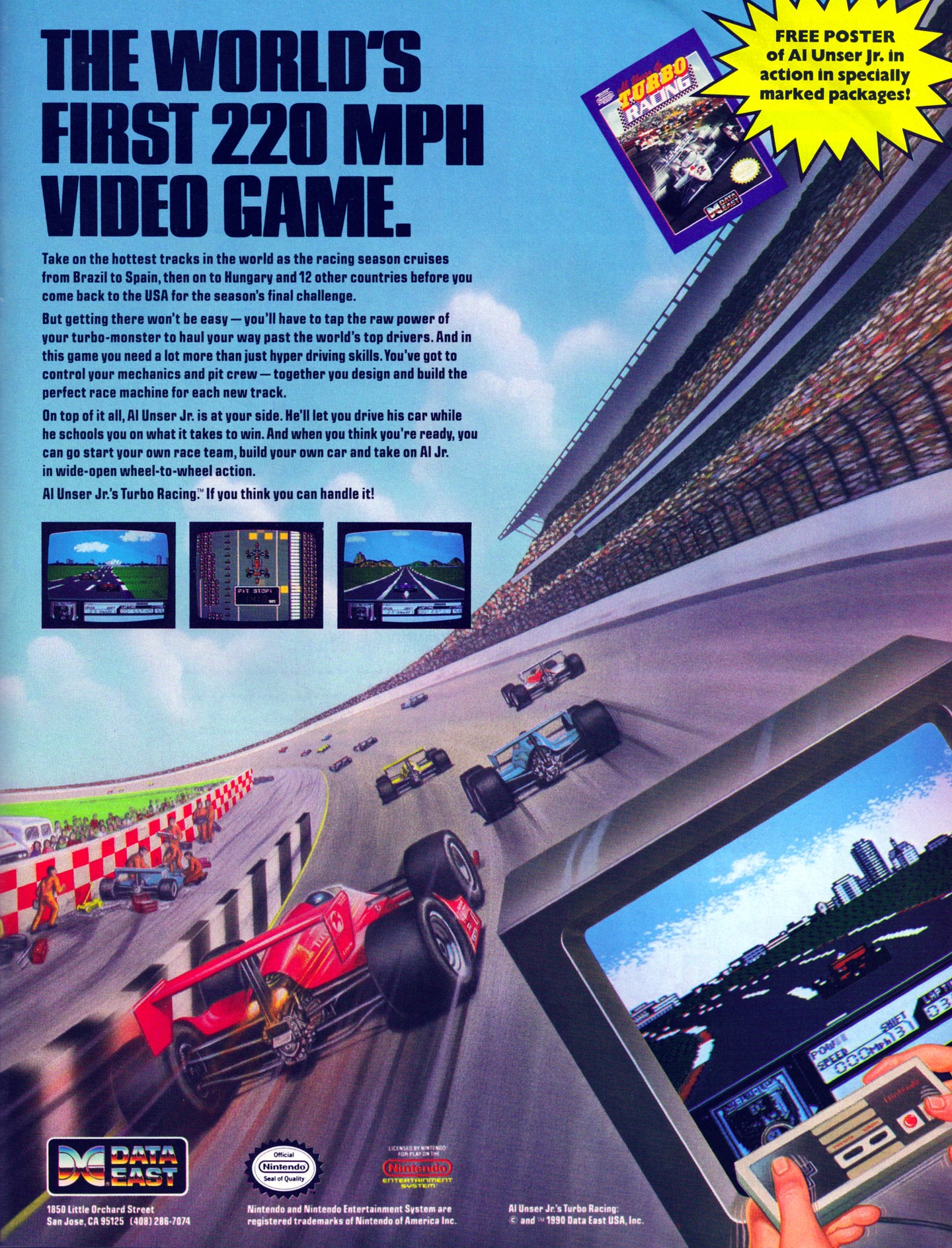 This is one of the first of several racing games set to appear on the NES this year. Al Unser Jr. Racing uses a first-person perspective from slightly behind the car you control. Dozens of race courses from around the world are used, each with its own twists, turns and maps. Turbo Racing is further expanded with a unique power-up system that allows you to tailor your vehicle from race to race. A tournament mode further enhances play with multi-lap races, pit stops and more!