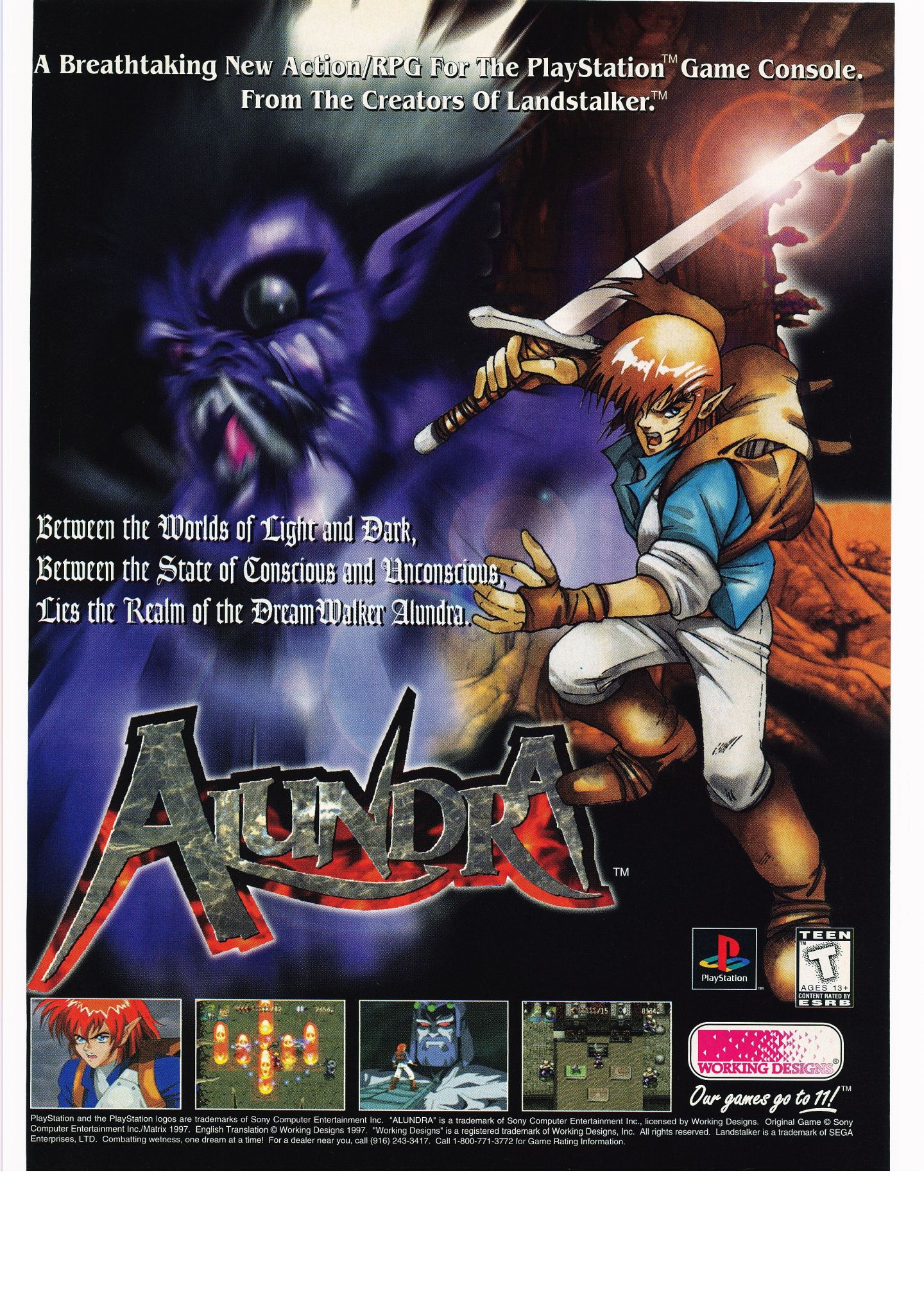 A puzzle-filled action RPG similar to Zelda. Alundra Is Working Designs' first RPG for the PlayStation (note that Working Designs recently announced they will soon cease publishing Saturn titles). Alundra was developed by Sony of Japan, and several of the programmers on Alundra's design team also worked on the classic Genesis action RPG Landstalker. The fact that the game was developed by Sony is a bit ironic; Working Designs originally said they couldn't translate Sony's Japanese RPGs for the PlayStation because Sony of Japan didn't want anyone but SCEA bringing out such titles in the United States. Obviously, that policy has changed.