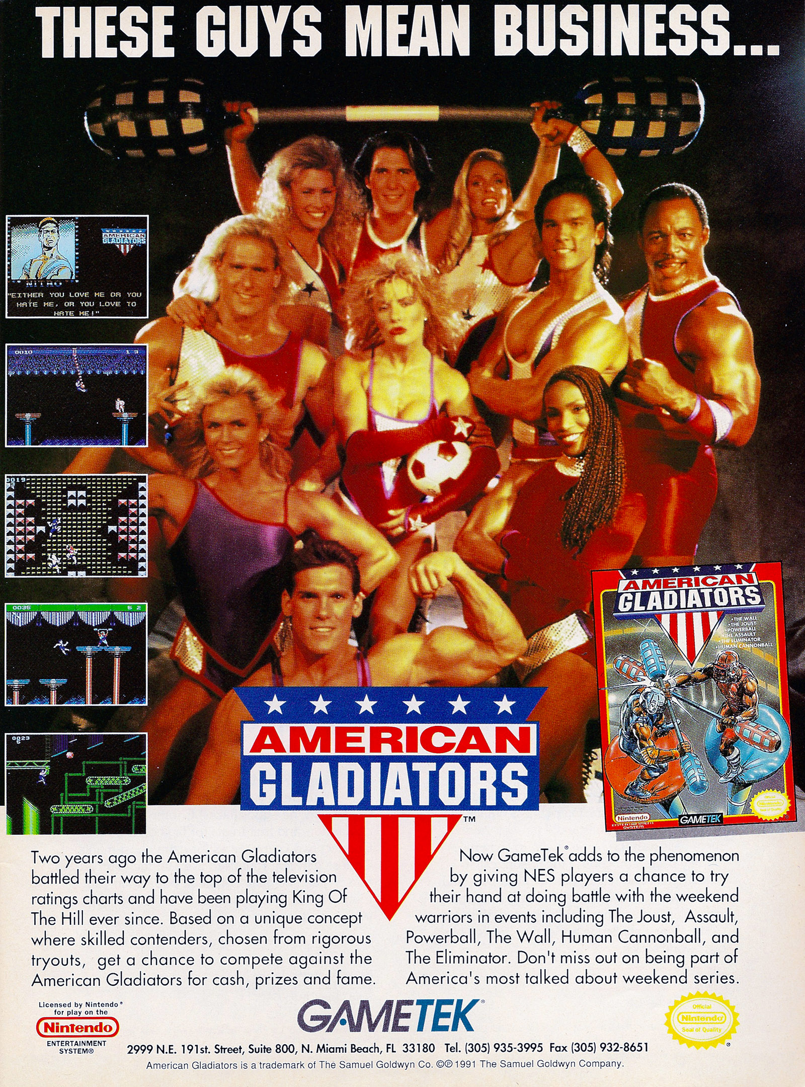 What's that? You say you're ready to take on the American Gladiators anytime, anyplace? Well, how about taking them on in the privacy of your own living room via your NES. Yup, the American Gladiators -- Nitro, Blaze, Laser, Zap, Gold, Gemini, and Lace -- stars of the hit television show, are ready to challenge you on your own turf -- but they're gonna' do it their way! One or two players go up against a different Gladiator in each of five events straight from the show: The Joust, The Assault, Powerball, The Wall, and Human Cannonball. If you can survive all four levels of increasingly difficult challenge (there's a password option that enables you to pick up where you left off). You get to compete in four final events in The Eliminator Round -- the I-Beams, the Hard-Bike, the Conveyor Belts, and the Zip-Line. So if you think you're hot stuff, you better be really hot... 'cause the Gladiators are smokin'.