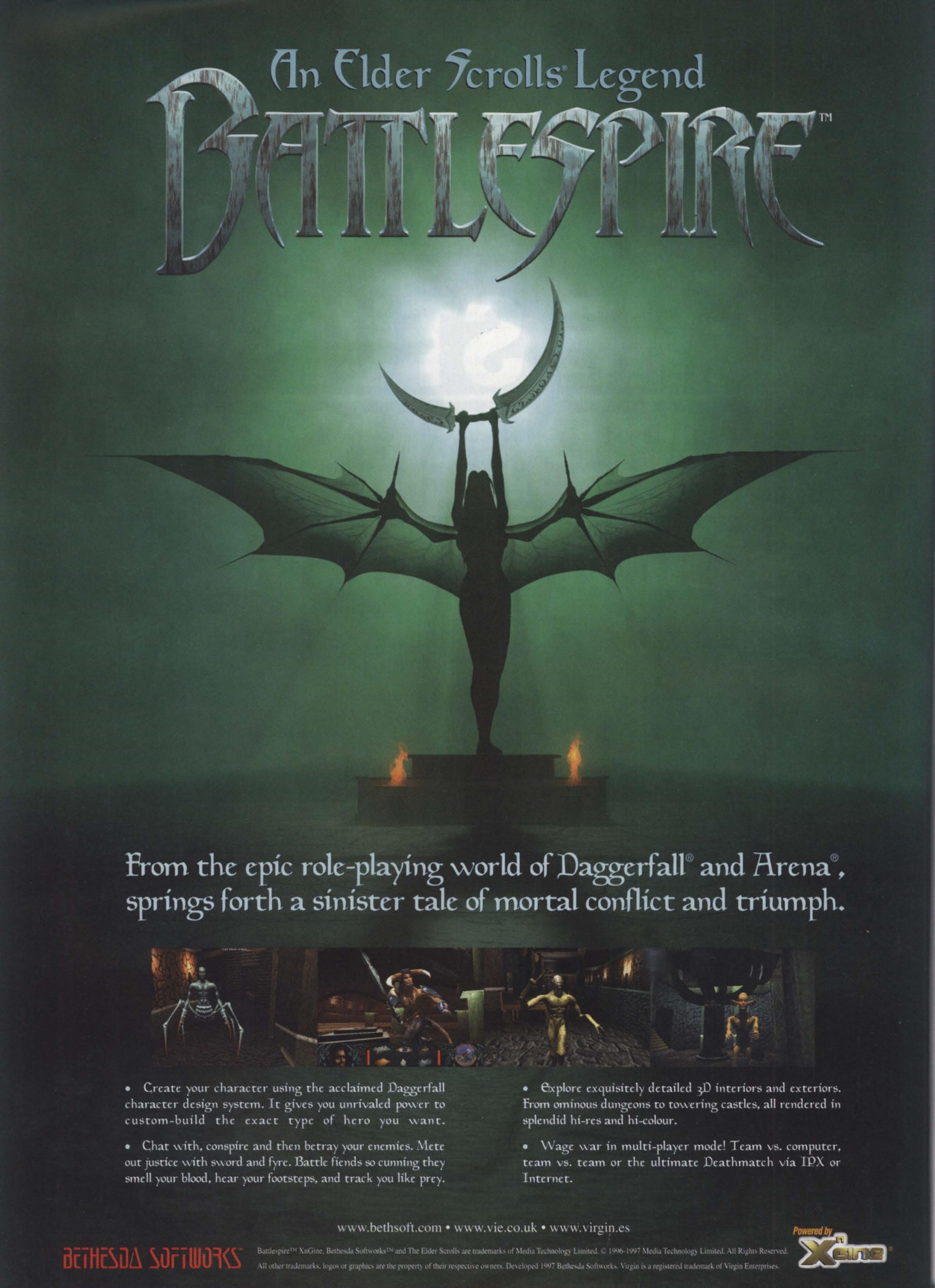 One of PC gaming's hot RPG series returns to the fray with Bat-tlespire, a side story in the Elder Scrolls universe that takes you back to the time of Arena, the first game. Upon discovering that the Emperor's fortress of elite wizards has been obliterated, you set out to stave off this new threat in a blend of action and RPG gameplay. Along with frenzied fights in the game's 3D environments, players will undertake the usual fare of RPGs, building experience, talking to NPCs and monsters, and more. To heighten the action side, the multiplayer game lets you compete in a death match or play team versus team .