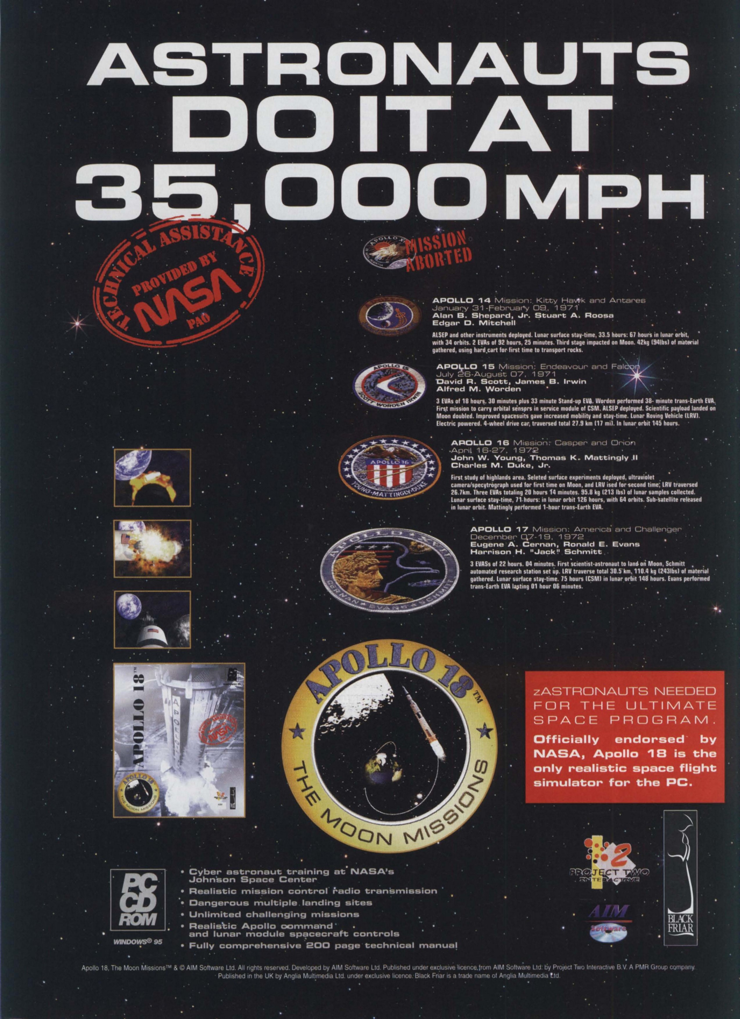 - I'm getting on a bit (or so these whipper snappers around me reckon), but even I was only six when man made his debut on the moon. That trip was part of the Apollo program that ended with Apollo 17. But now, thanks to the wonders of silicon, you can embark on Apollo 18 - a secret mission back to the moon to pick up some human detritus. Your first task in Apollo 18 is to sit down for 30 hours or so and immerse yourself in the contents of the training disc. After that, you just may be ready to play the game proper. Try starting with take off. You're sitting there, the engines are roaring and mission control is barking commands at you. Your main Cchallenge' here is to click on the right button on cue. Miss three times and the mission is aborted. Fun! The trouble is that there are hundreds of commands, and the multitude of buttons that lie on the far-from-inspiring interface will have you flapping about in bewildered confusion. The odds against a successful take-off are high. Mind you, succeed and you will be rewarded with a little video of a pointy white tube hurtling across the sky. Cor! The developer himself only managed three successful missions, so don't expect too much. In fact, don't expect much at all from this shoddy pile of cack. Neil Armstrong loved it, claimed the developer bloke, but he doesn't do product endorsements so he didn't endorse this. Jimmy Hill, thought I, rubbing my chin. Apollo 18 is as dull as they come, with poor graphics and a horribly anal feel about the whole thing. One for dedicated rocket scientists and space technology saddoes only.