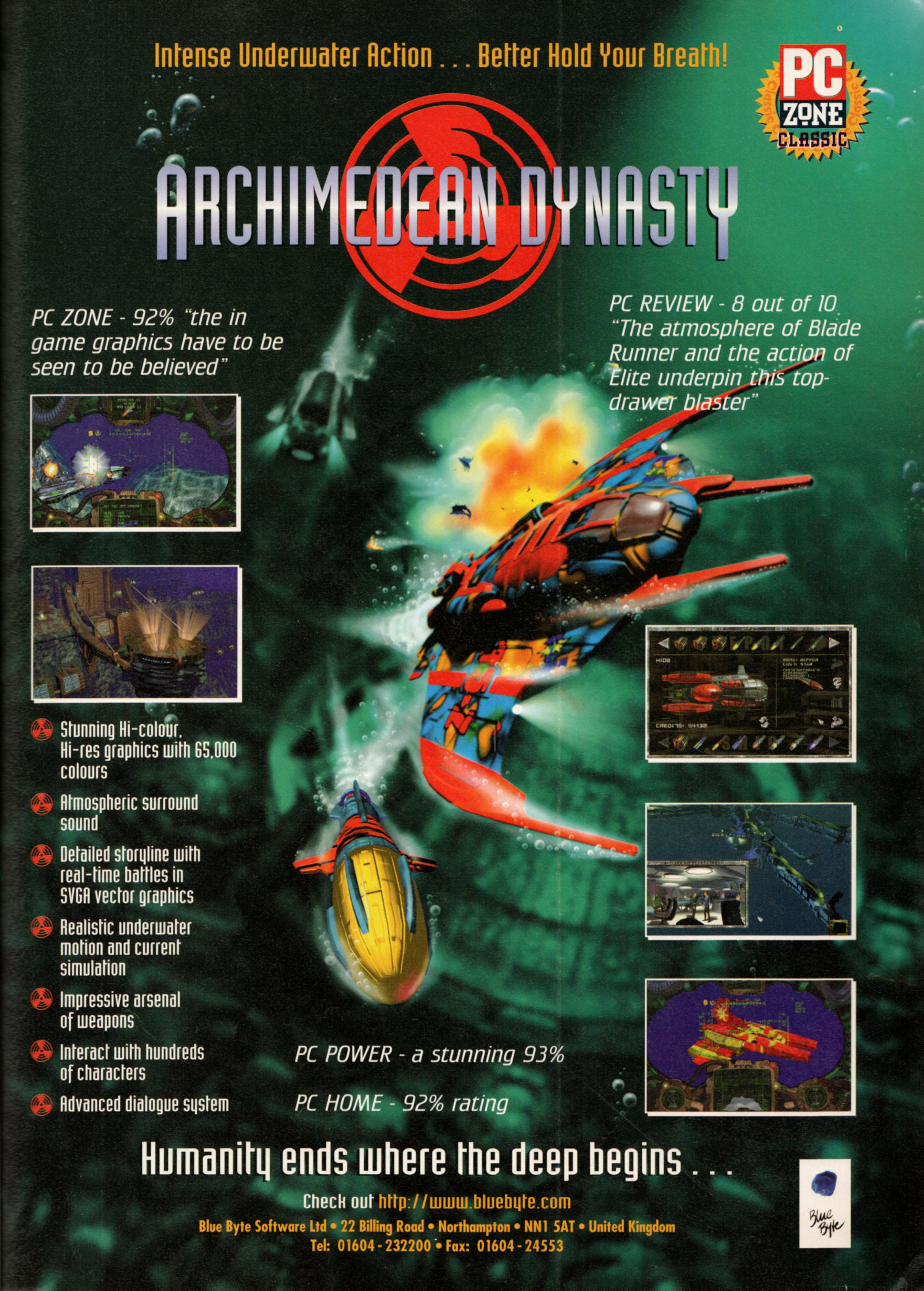 How to describe it? Well, take your Wing Commander series, throw away the 'space-shooty' bits (Space-shooty? - Ed.), throw away the Mark Hamill/FMv bits so that all you've got left is the concept, replace them with the underwater simulation bits from Subwar 2050 and a gamut of pre-rendered animations, improve the entire gameplay by several hundred per cent, tart it all up and bingo, one Archimedean Dynasty.