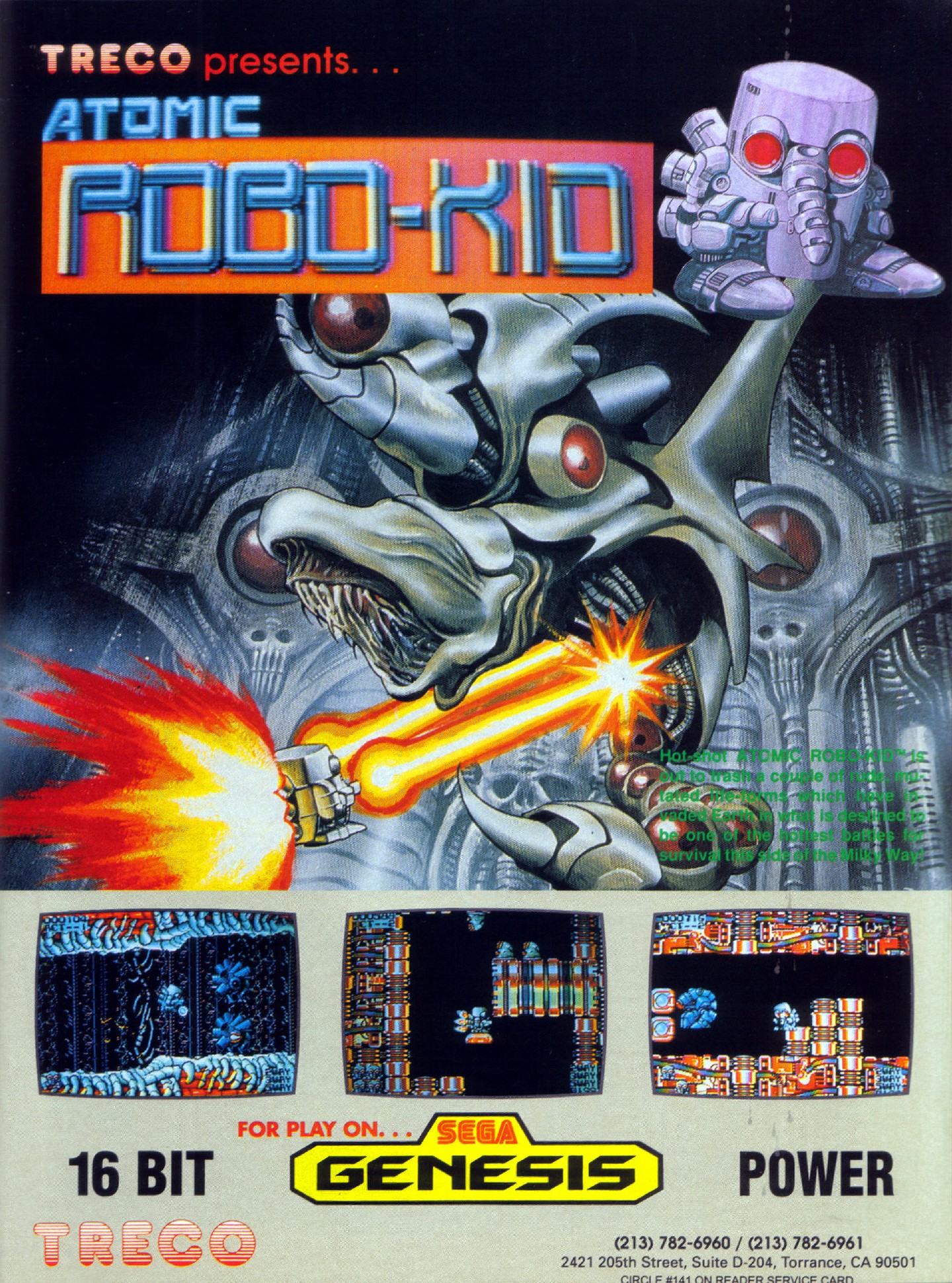 Treco's Atomic Robo-Kid is one of the first third party Genesis titles available, and it backs up Sega's promise of top quality third party support. Based on an arcade title that wasn't widely distributed, the game features especially gorgeous graphics with a very 3D feel. In the end you'll destroy the mutants because you have no other choice -- it's human-kind's only chance for survival. No Kidding!