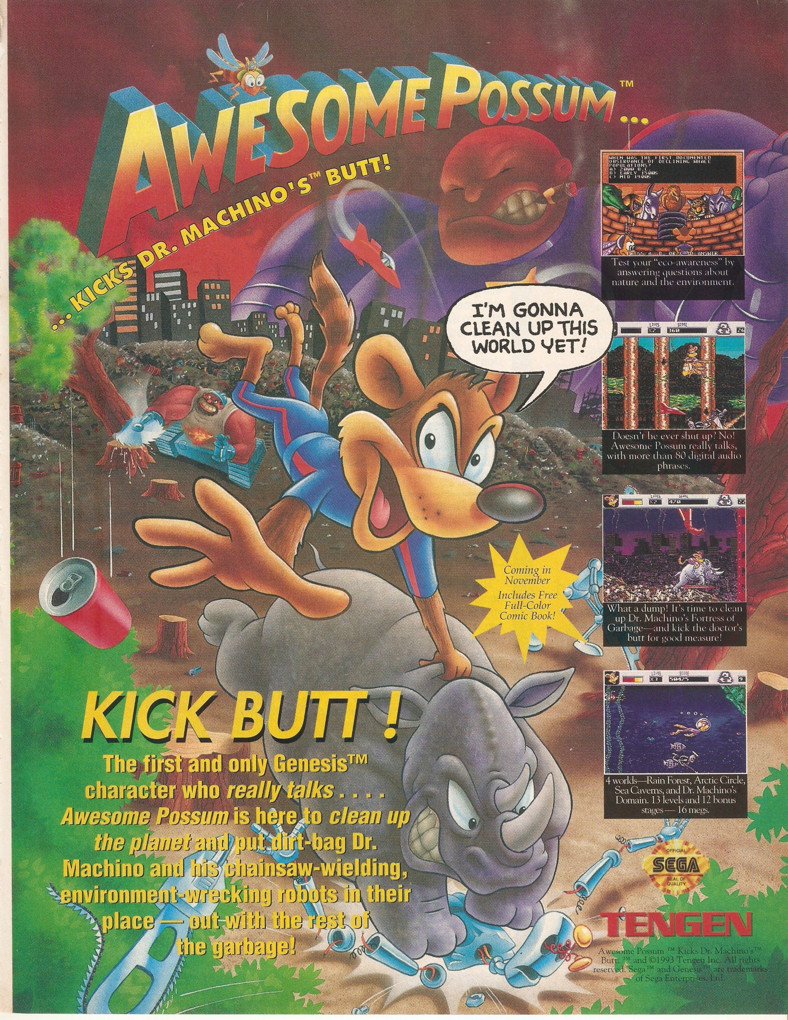 Awesome Possum y is the latest woodland creature to hit the trails in an action/adventure game. Tengen's set their little marsupial out to clean up the trash and pollution in four worlds: the Rain Forest, the Sea Caverns, the Arctic Circle, and evil Dr. Machino's Domain. A nice idea for a game, but this possum definitely isn't Awesome.
