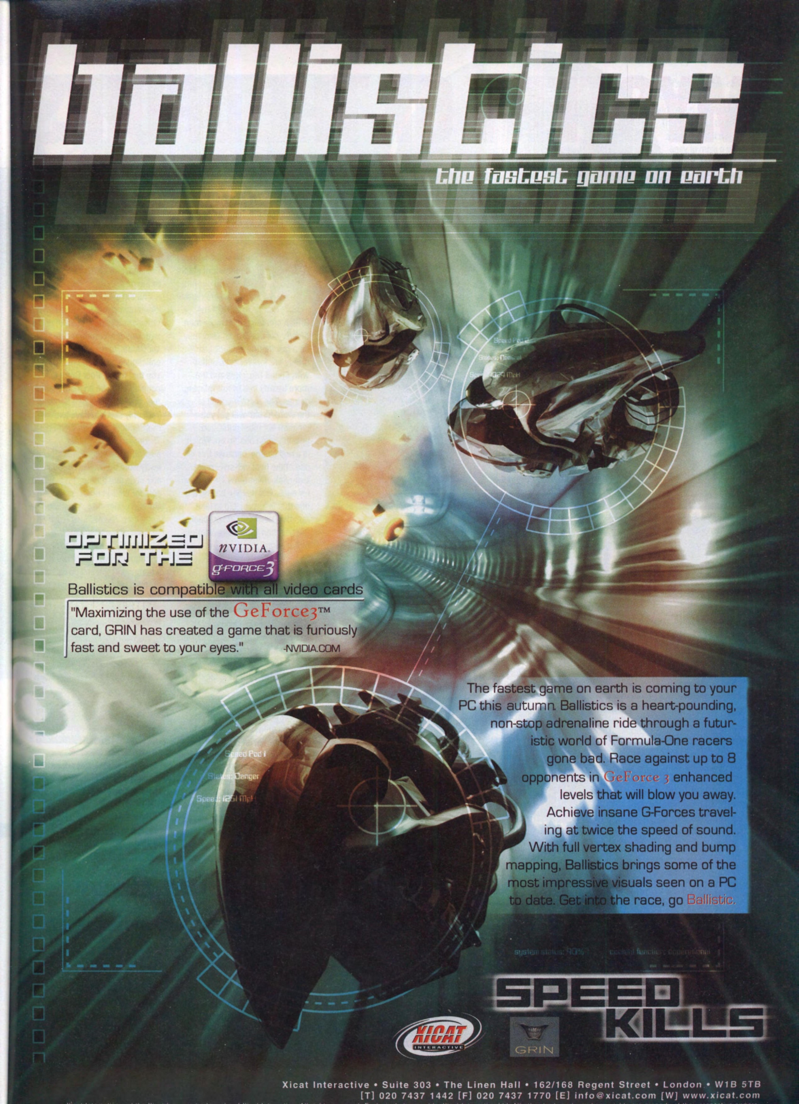 For starters, Ballistics is, in fact, the fastest racing game ever. There’s no speed limit attached to its magnetically driven hoverbikes, the ceiling being determined rather by your own reflexes. In place of a conventional track, racing takes place inside a magnetic tube, the only impediments to acceleration taking the form of red barriers -walls, bumps and crossbeams -clearly best avoided. Hitting blue coolant pads, on the other hand, is a good thing; running over yellow booster chargers positively essential. It's a logical extension of the up-wall action of such games as Killer Loop and Rollcage Stage II, and makes for far greater emphasis on pure speed.