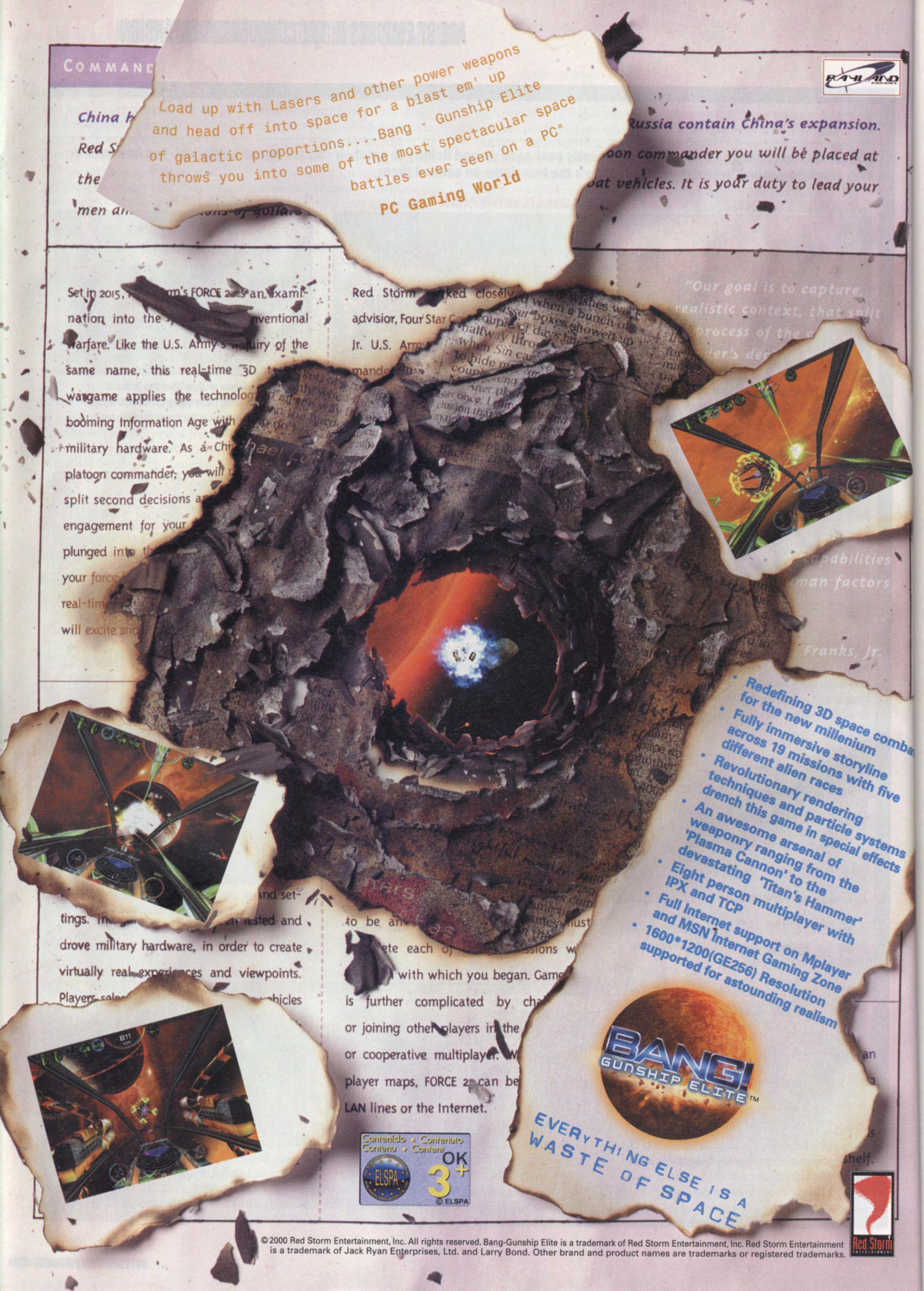 Funnily enough, shallow gameplay couldn't be more rewarding. Mind-blowing 3D explosions, sprays of coloured light, and panoramic views of planets hanging in the void are standard issue. Pilots intelligent enough to bypass the musically challenged briefings and skip right to the candy-coated action will find their zeal justified. Progress, schmogress, Bang! operates on the same premise (or lack thereof) behind hits like Galaga. Put terrible voice acting, great graphics, huge guns and a license to kill into one title and you've got the gaming equivalent of an Evil Dead film. It may be shallow, but it's entertaining.