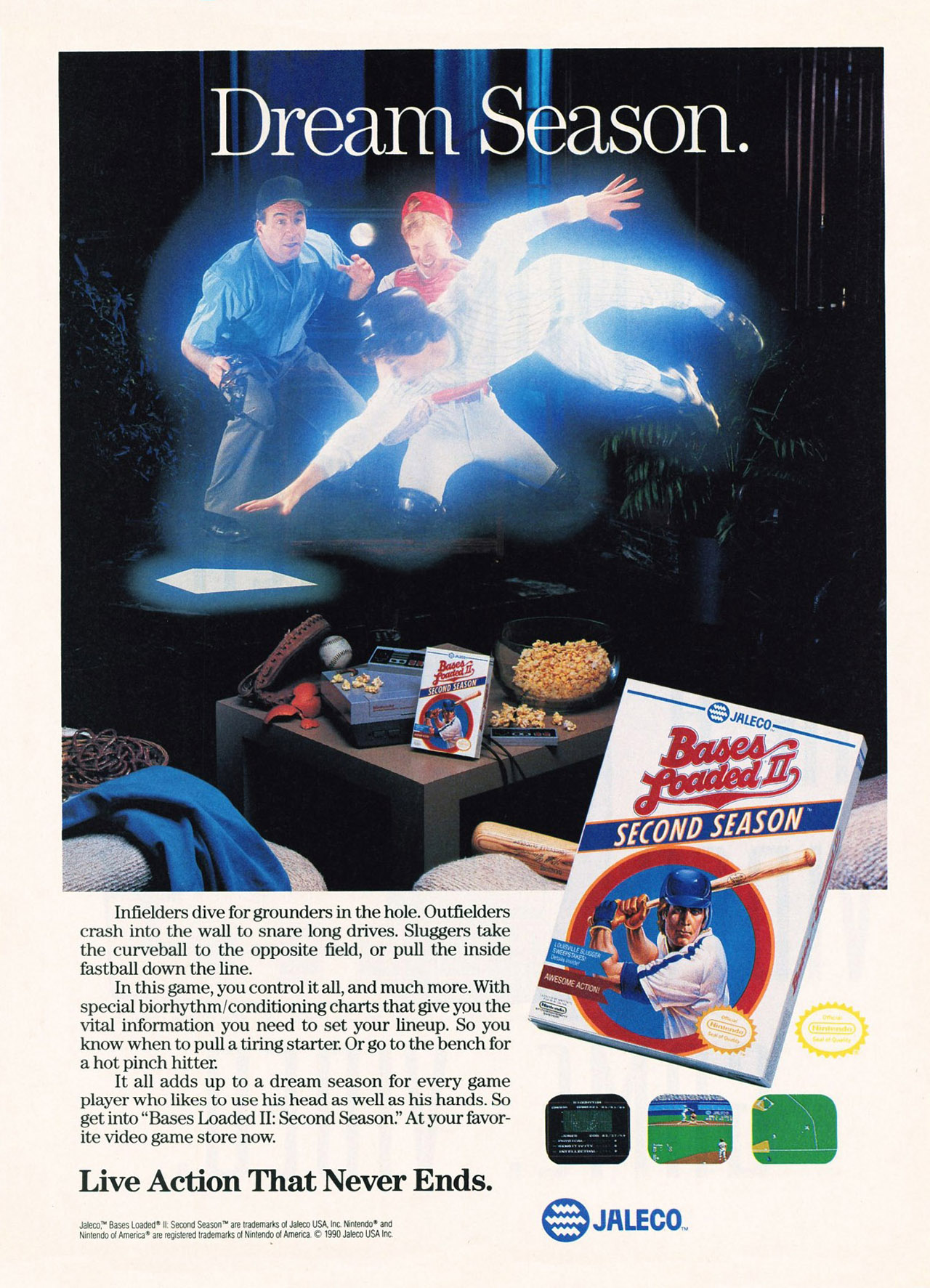 It's here-the Second Season of Bases Loaded. This long awaited sequel to Jaleco's classic Bases Loaded takes you through another season of nonstop baseball action. Play a full 130 game season against a friend, or the computer. Your team is from either an Eastern or Western division of a fictional league. Win 75 games and you'll take home the pennant and head for the World Series! But what really makes Bases Loaded II stand out from the crowd is a special system designed to simulate players' streaks and slumps.