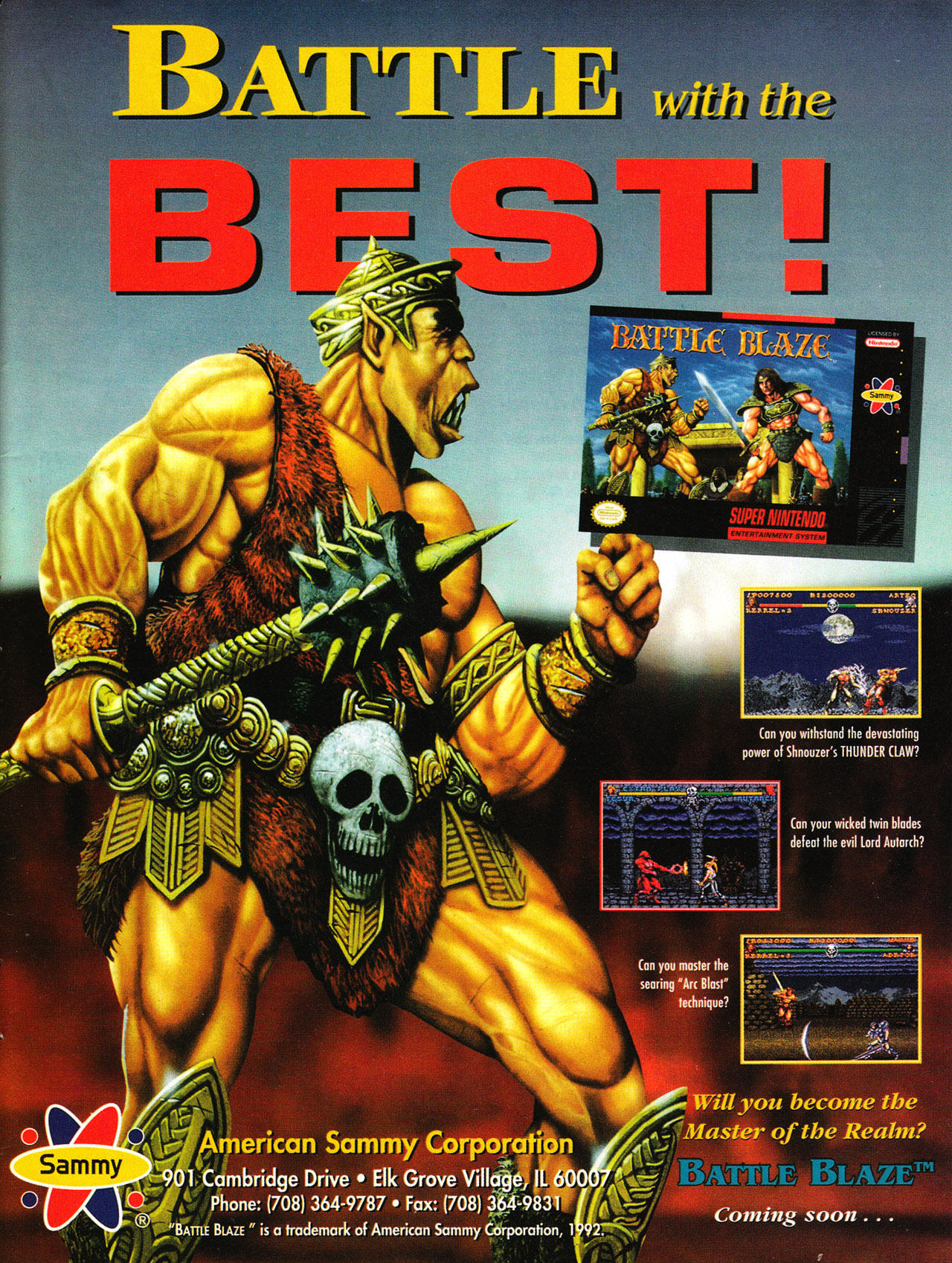 Battleblaze by American Sammy is an awesome-looking SNES game set in-a fantasy realm of knights, warriors, ogres, and demons. This cart displays a great-looking fight, and the CPU will chop you down in no time.