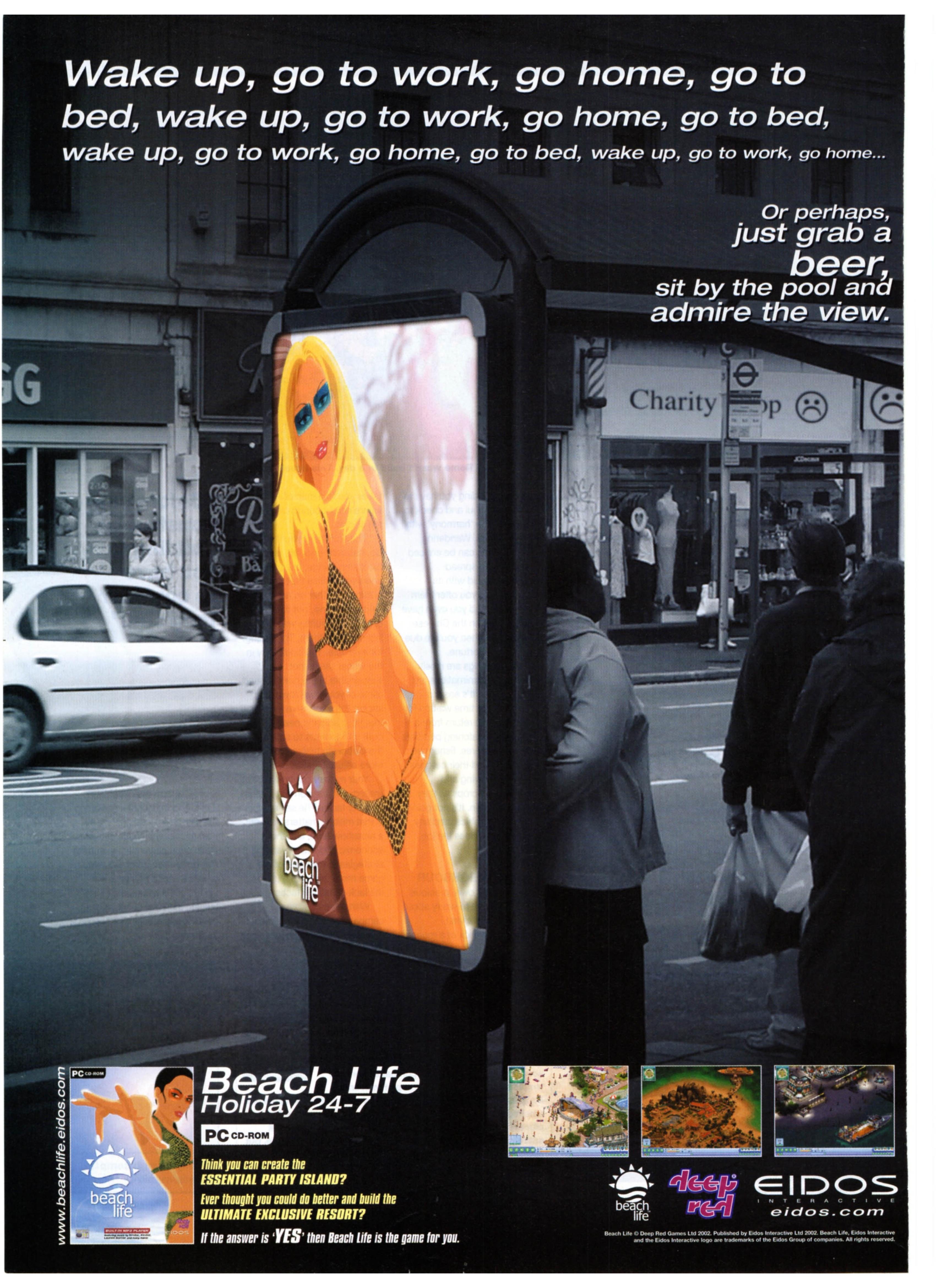 Of course, the fact that The Sims is still riding high in the charts two years on is definitely part of the motivation behind Beach Life. Livingstone, not one to miss out on a good business opportunity, makes this clear when he says, "young people in particular have a lot of fun on holiday. It seemed to me to be the perfect experience to simulate in a game. Cheap booze, loud music, romance, polluted water, mosquitoes, hot sun, beach volleyball and everything else will combine to create people-watching at its best". We especially like the bit about "young people in particular". He sounds like your grandad giving you a pound to go to the cinema. When Beach Life comes out in the summer we’re not expecting a classic, but if all goes well it could prove to be a pleasant surprise. After all, you don’t need to go on a Club 18-30 holiday to enjoy giving a bunch of tossers food poisoning.