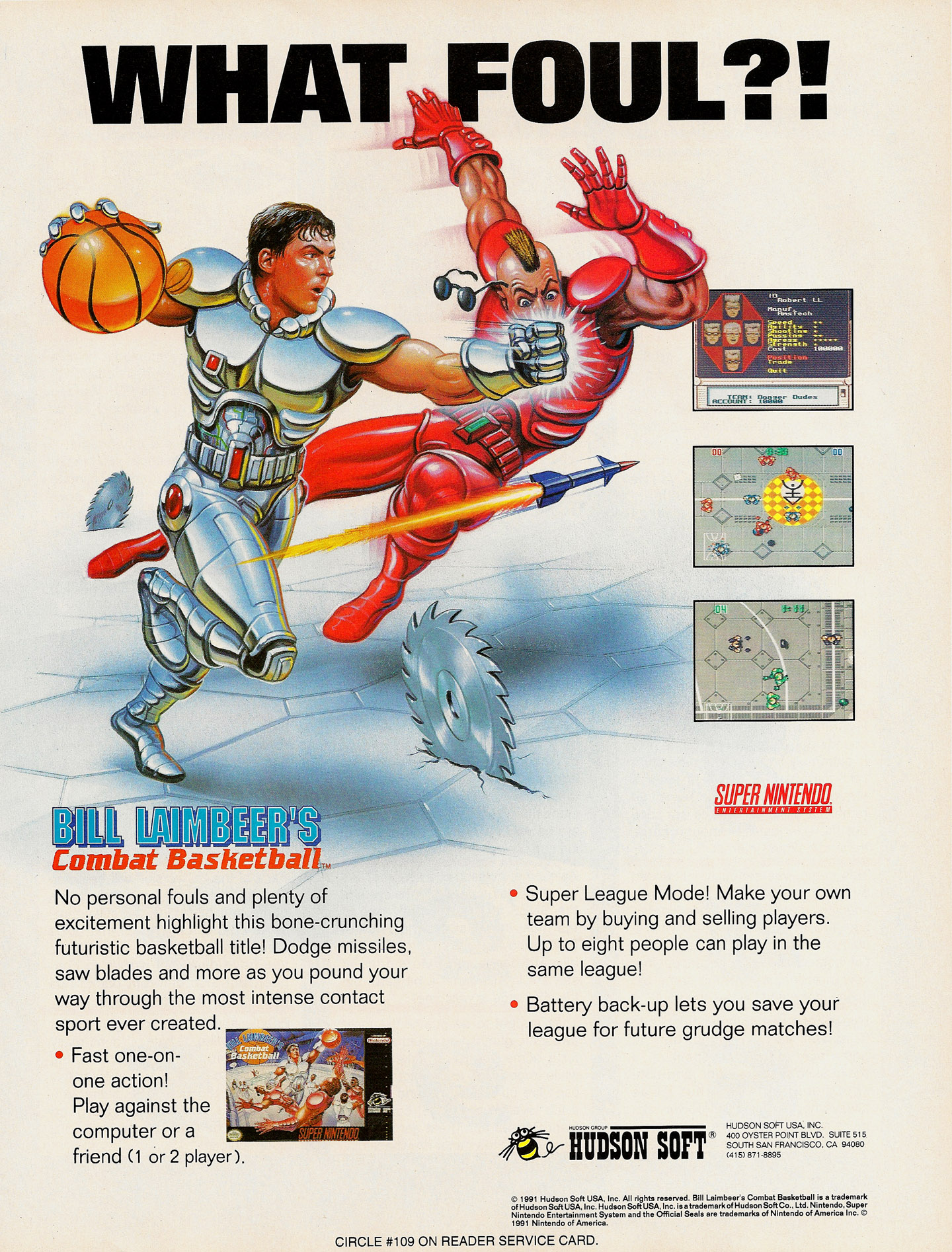 Hudson is entering the sports theme with a futuristic contest of agility and reflexes. Fast paced action takes basketball into a new dimension on the Super NES.