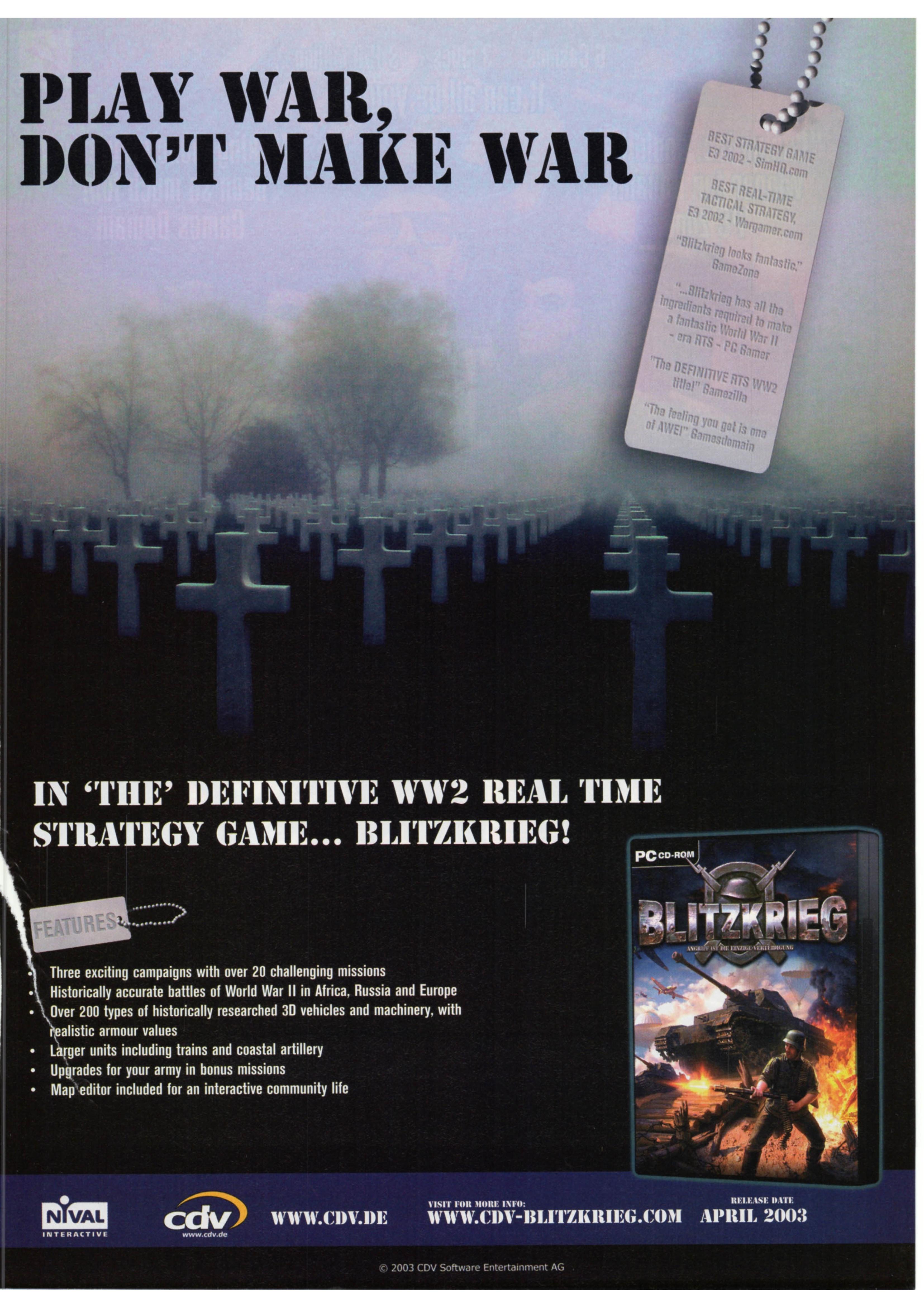 Blitzkrieg update: The retail release of this exceptional game still has some spelling and awkward grammar issues but it's a Euro-product and any minor documentation glitches are more than compensated by the knowledge and execution of the subject matter. The factual issues mentioned in the main review have been addressed. The multiplayer client for GameSpy opponent matching service is sparse but serviceable. .