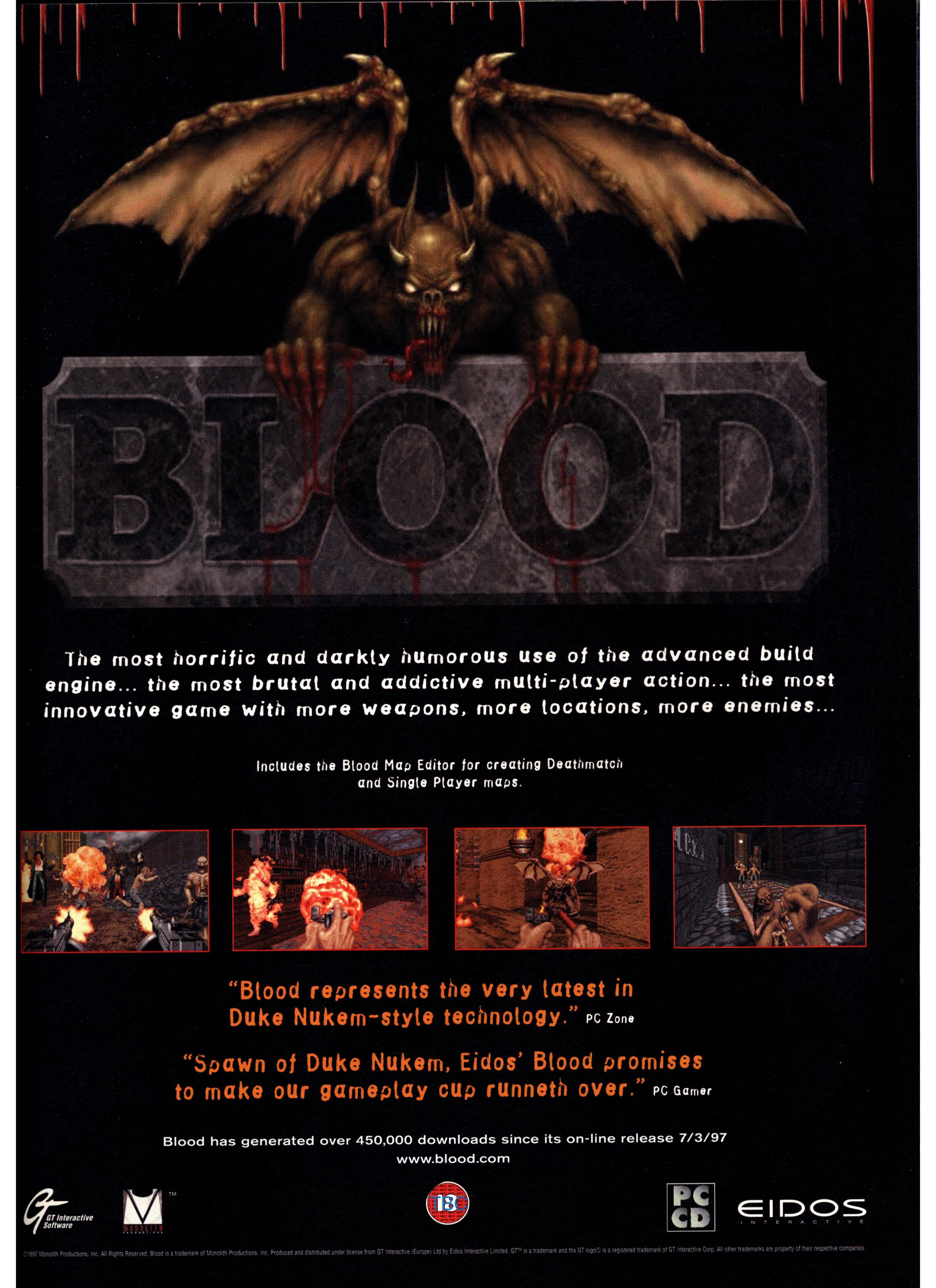 If Monolith could have tied the level design and action more closely to a real storyline, worked to smooth the engine a little, and created a few new types of monsters, Blood might have risen another notch or two up the 3D food chain. As it stands, the game is a little too uneven to be successful. There are some redeeming moments of wit and creative level design, but unless you've played all the way through better games likeQuake, Eradicator or Outlaws, you may want to try one of them instead.