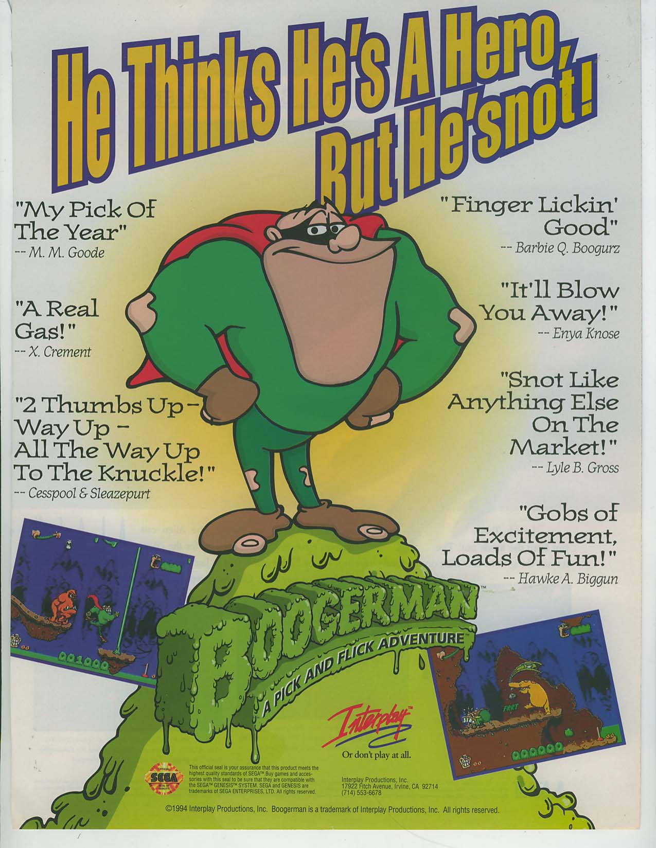 Boogerman: A Pick and Flick Adventure is a 2D platform game created by Interplay Entertainment. The game was released for the Mega Drive/Genesis and SNES in 1994. The game features about 20 levels of dirt, slime and bad taste in worlds like "Mucous Mountains", "The Pits" or "Flatulent Swamps". Parents will want to keep this game away from young children.