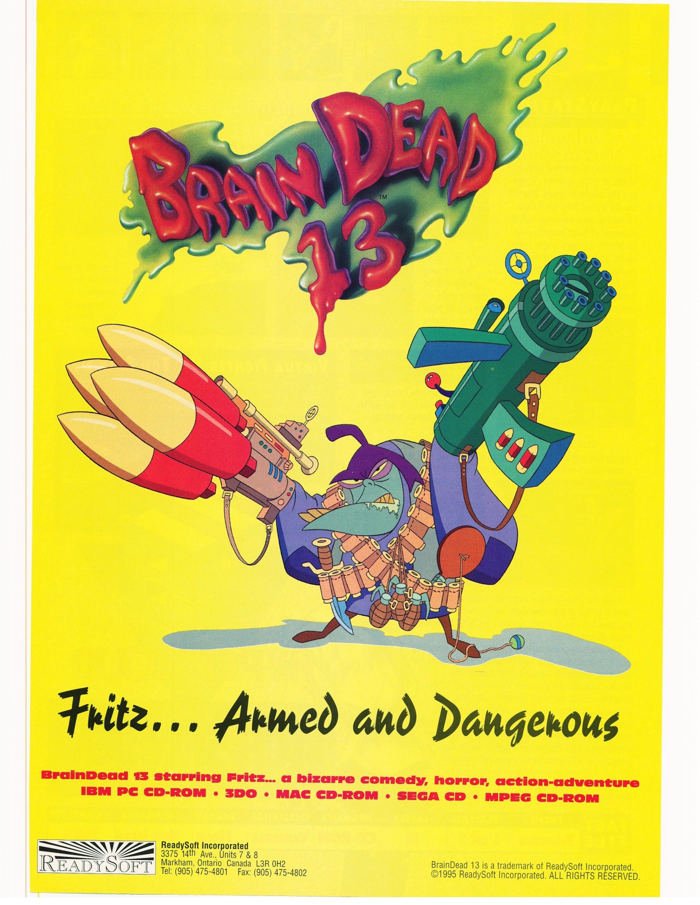 From the ReadySoft crew that brought you Space Ace comes another animated adventure. The star of this graphic adventure is Lance, a computer repair guru. Things get strange for Lance when he's called to Dr. Nero Neurosis' castle late one night. After he fixes the mad doctor's computers, Lance learns of the doctor's plan to dominate the world. In order to stop the doc, Lance has to search for the Chamber of the Brain. Along the way, he must evade Fritz, a half-human, halfpet who's been instructed to destroy him. The demented castle holds all kinds of other surprises, including campy monsters like FrankenJock and Draculette. Brain Dead 13 boasts orchestrated digital sound and breathtaking car-toon-style animation.