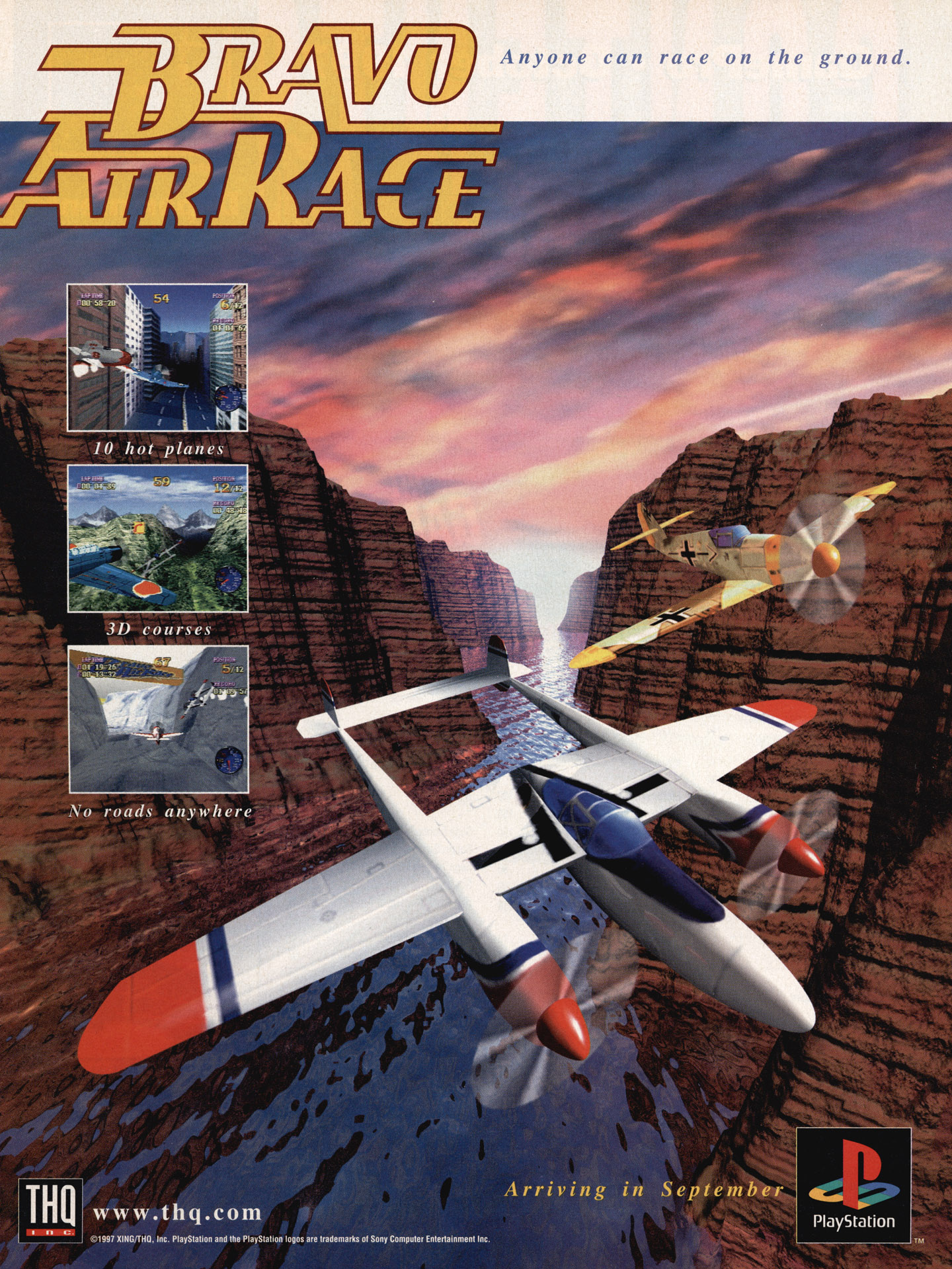 Actually, this is the first racing game to feature airplanes. And you don't have to worry about shooting down opponents or dodging enemy fire like in most other flying (and many racing) titles. Bravo Air Race's planes aren't equipped with weapons; the only power-ups you'll find are turbo boosts and a few other goodies. The emphasis in this analog-compatible racer is on ultrafast racing and split-second maneuvering.