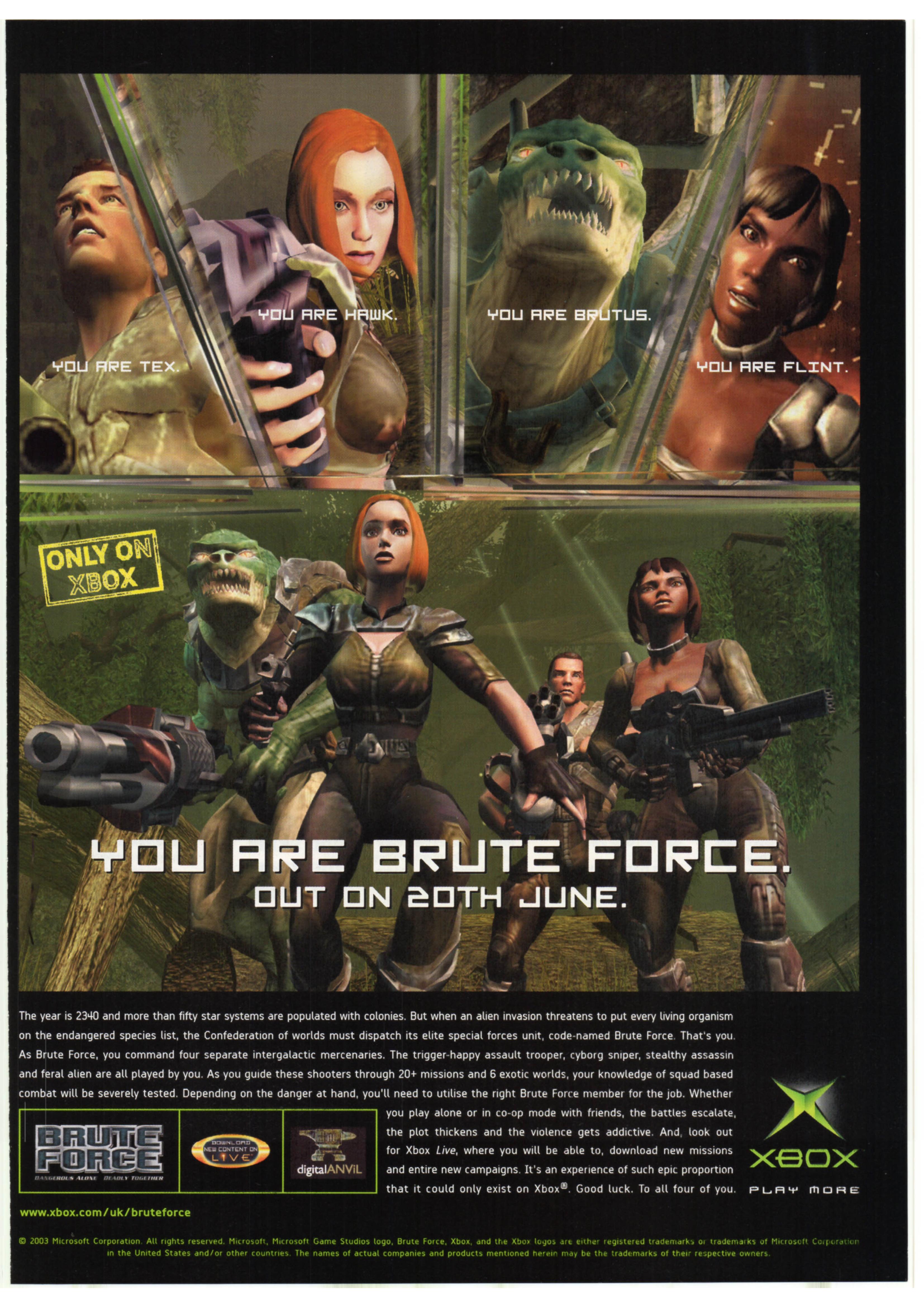 This cooperative squad-based shooter thing is nothing new. Many have come before (X-Squad, Rainbow Six, etc.) and many have failed. Sony's SOCOM is about as close to console-perfection as anyone's gotten lately, but then it's not on Xbox, is it? So, answering the call for squad-based action, Microsoft enters the fray with some chicken soup for the special-ops soul: Brute Force. BF is a third-person shooter that relies on the diverse qualities of its four well-armed protagonists --Hawk, the sniper; Tex, the gung-ho hard case; Flint, the Halle Berry-lookin' scout and Brutus, the alien--to invigorate the gameplay.