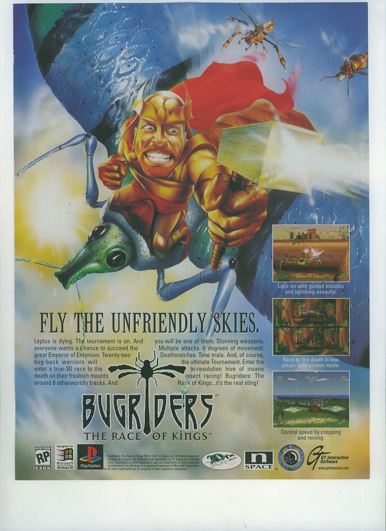 BugRiders takes a can of Raid to the Panzer Dragoon formula by making your ride work against you like a spoiled horse. Not only does the bug not want to go where you steer, but, of all things, you have to whip it to make it fly fasten Inflict too much pain and it refuses to fly at all. To add insult to frustration, you re on a rail system, so only a small fraction of the steering is yours to control anyway.