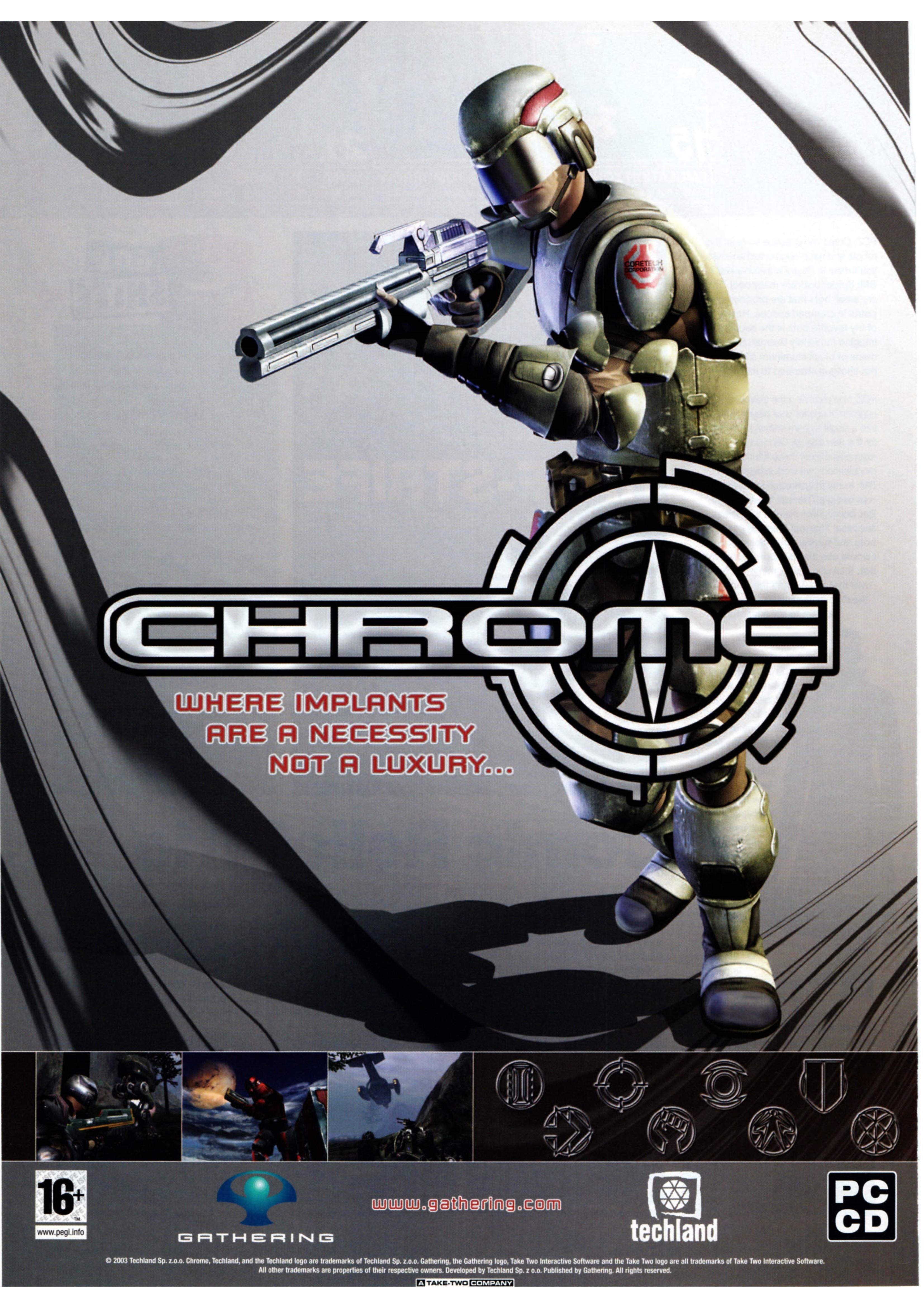 Having played several of the nearcomplete levels, we've been increasingly entertained by Chrome. The indoor bits are currently a bit tedious, but the free-roaming outdoor sections are shaping up excellently. The variety of gameplay also can't be faulted - in addition to the indoor/outdoor dynamic, you've got a smattering of on-rails sequences, vehicles and boss battles, as well as a generous selection of mission objectives. Certainly the whole thing has a very low-budget feel to it - the cut-scenes are bad, the voice acting laughable -but there's plenty of satisfying action to compensate. If the developers can only beef up the repetitive indoor gameplay before the game ships, we could be looking at some hospital-grade stuff here and not just a quick back-alley wheeze on a spray can. Check out the exclusive Chrome demo on our cover discs and judge for yourself.