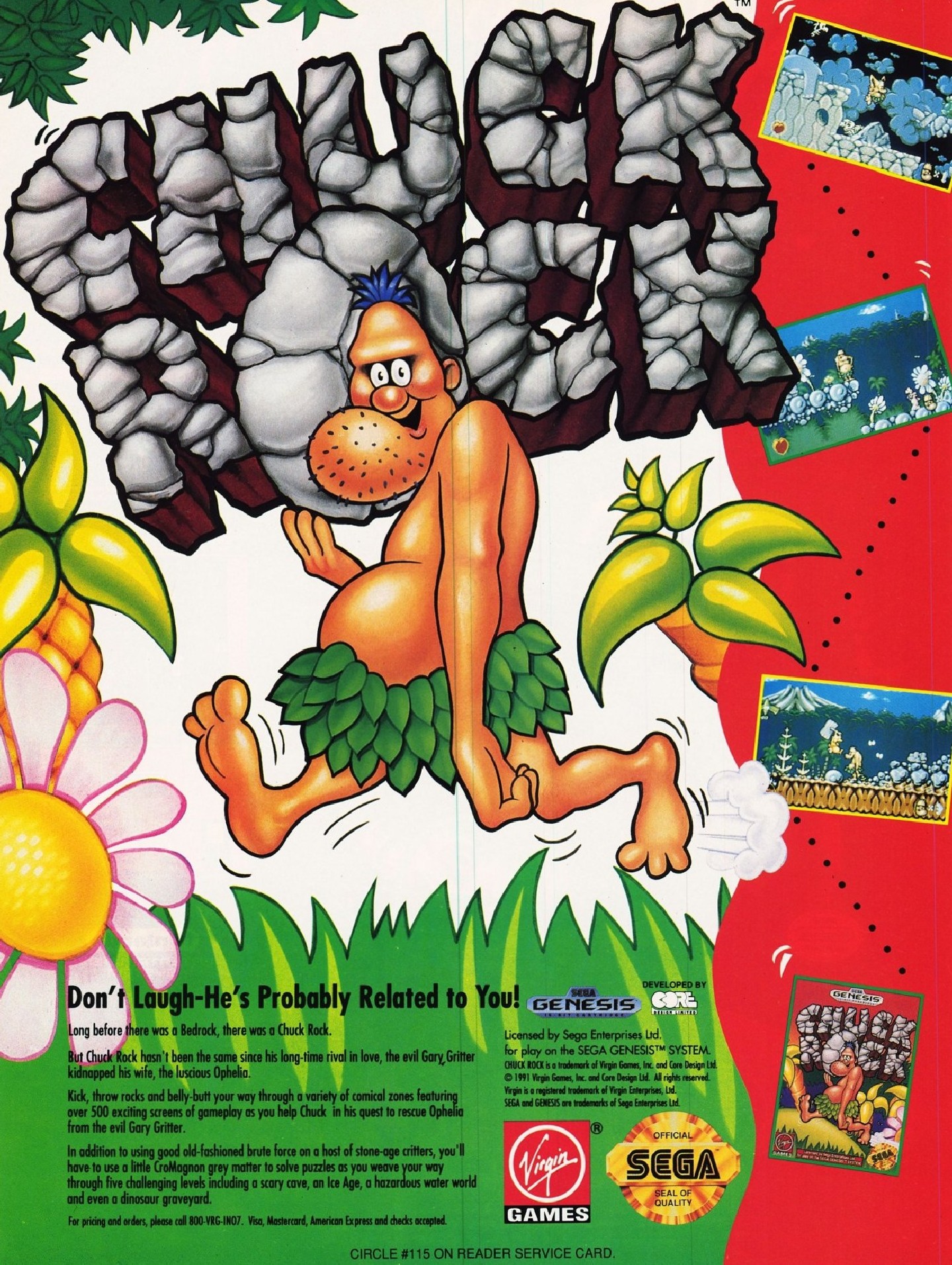 Chuck Rock's committed a major land-of-the-lost faux paux -- he's lost his lady. Yep, Chucky let his guard down and a fellow stoner, Garry Glitter, jumped in and heisted Ophelia. If Chuck is ever going to be respected as a caveman and rock musician in the prehistoric community again, he must rescue his beloved cave-gal. Furious and womanless, Chuck lumbers off into the wild and wooly dinosaur infested jungles to begin his journey. It's a long way to the top if Chuck wants to rock and roll -- this Stone Age adventure by Virgin Games covers 15 territories.