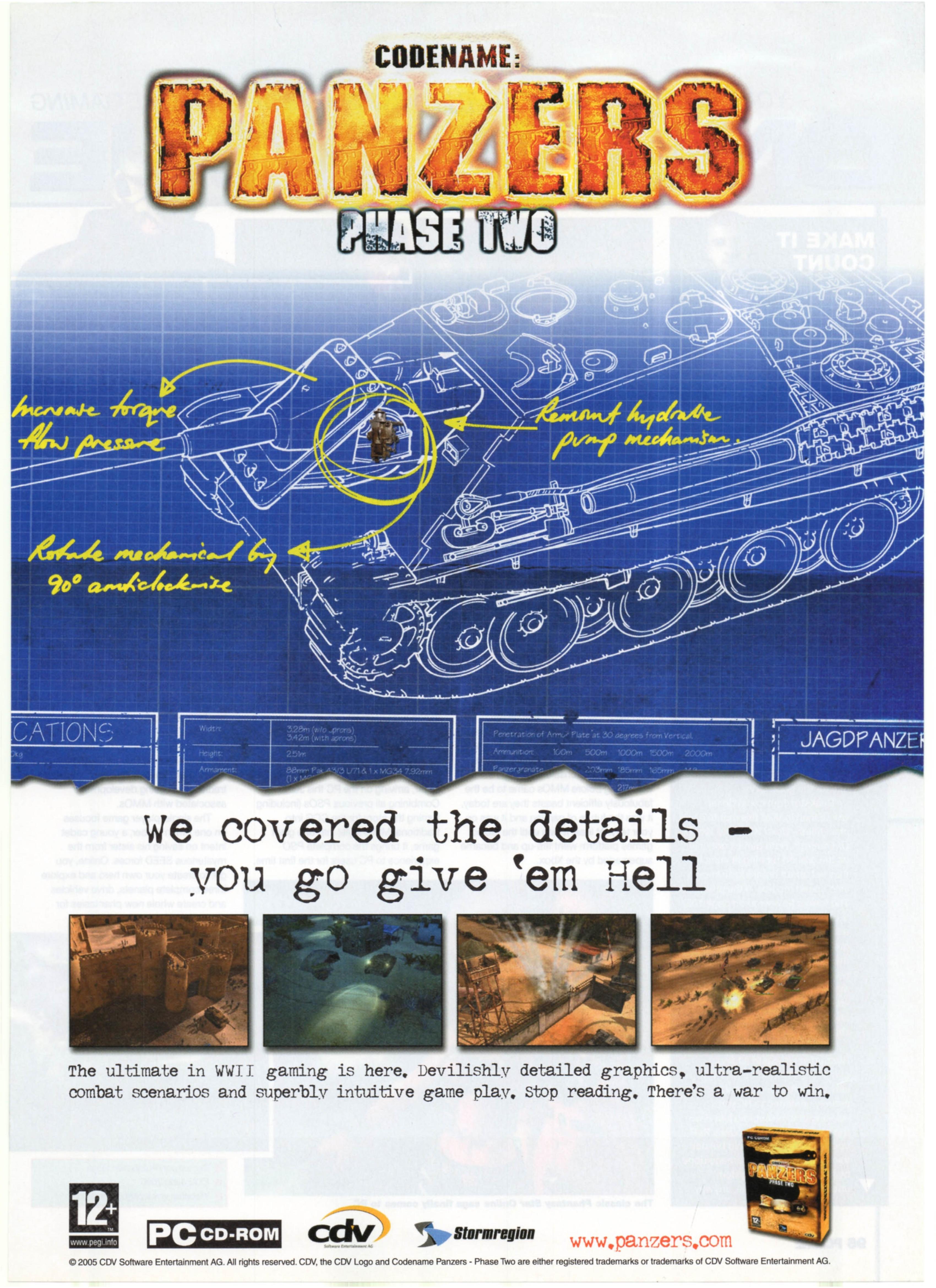 Panzers Has Cot to be the worst codename ever. Codenames are supposed to be smokescreens to ensure secrecy for your mission, not to tell your enemy exactly what the hell is going on. This is a WWII RTS specialising in tank-on-tank action, so if you're going to give it a codename, make it 'buttercup', or 'peckerneck' for god's sake . But that's Codename Panzers: Phase 2 all over - there's little surprising, covert or unexpected about it. Like its younger brother released last year, it parades its tried-and-tested RTS conventions like the Soviet Army showing out at Red Square. As soon as you've left-clicked a tank and right-clicked something for it to blow up, you feel like a seasoned vet. This is WWII-themed strategy made as easy and fun as jumping into a sandpit and bashing two Tonka toys together.