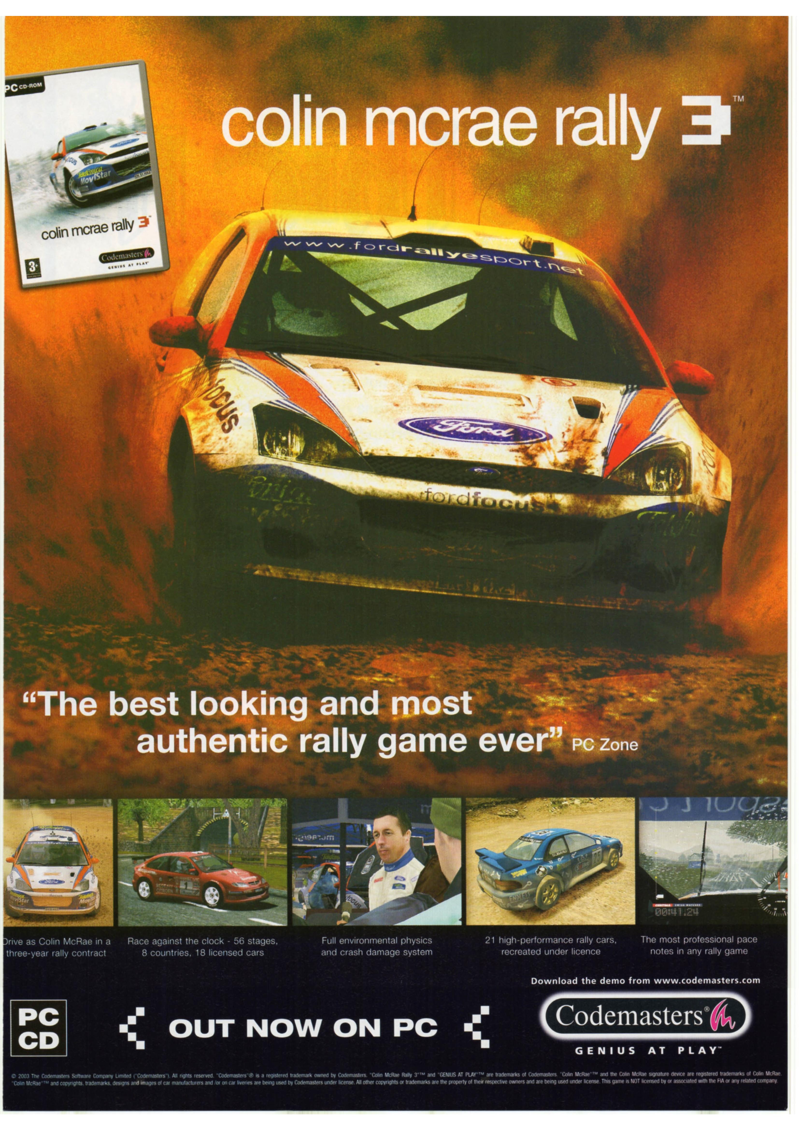 While parental groups have rallied hard against the rising tide of rally-mania, pointing to a sharp rise in sideways action on country roads, the phenomenon shows no sign of stopping. Fans are now gearing up for Colin McRae Rally 3, the best-looking and most authentic rally game ever. So come on everybody, get ready to 'Do the Colin' one more time!