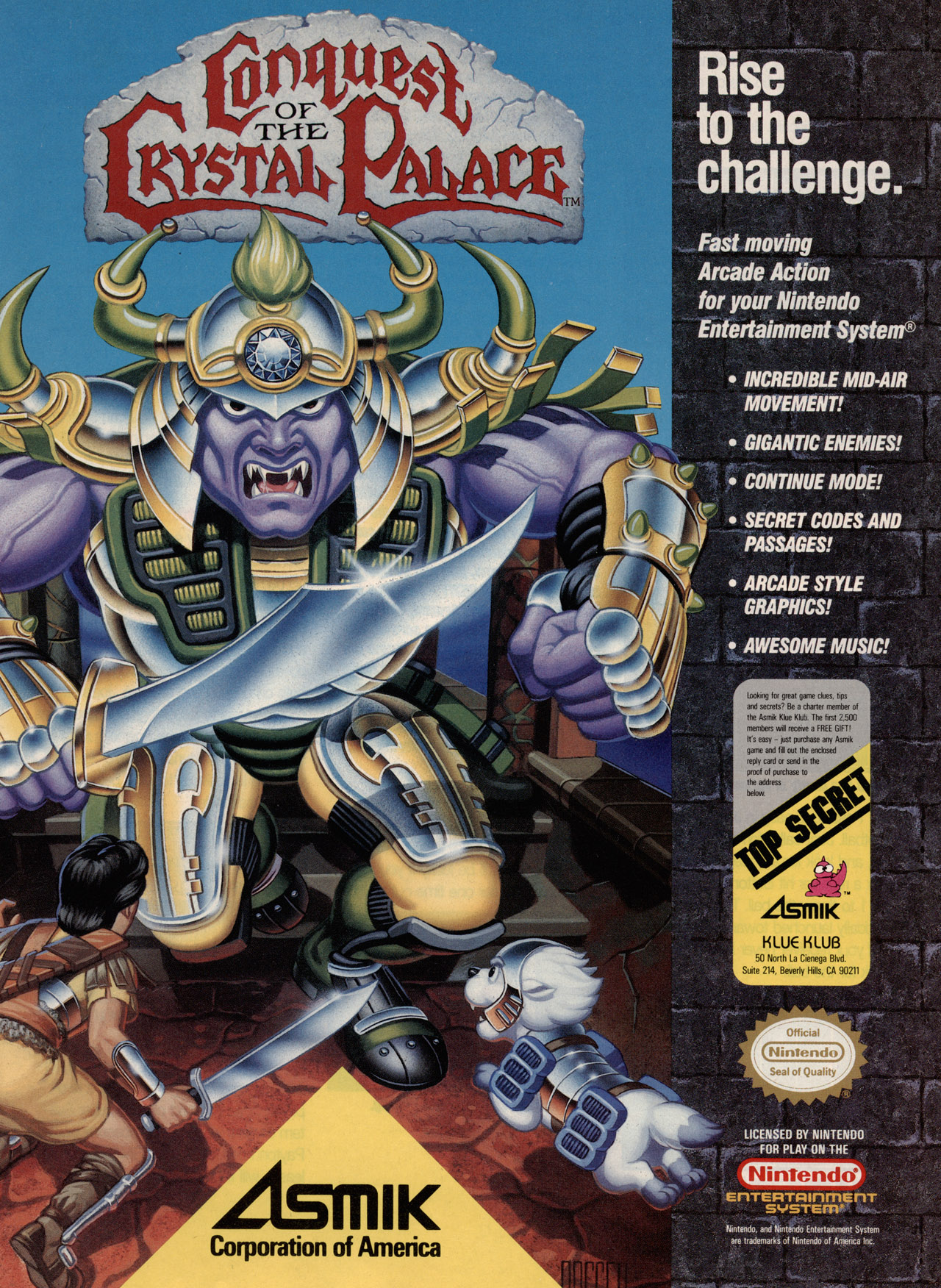 Pssst... psst... hey, you. Yeah, you. Have you heard about Asmik's new one player adventure game, Conquest of the Crystal Palace? You haven't? Well, you're gonna' miss out if you don't catch the news about this new multi-scrolling, action-packed game, so listen to Prince Farron's outrageous tale of woe.