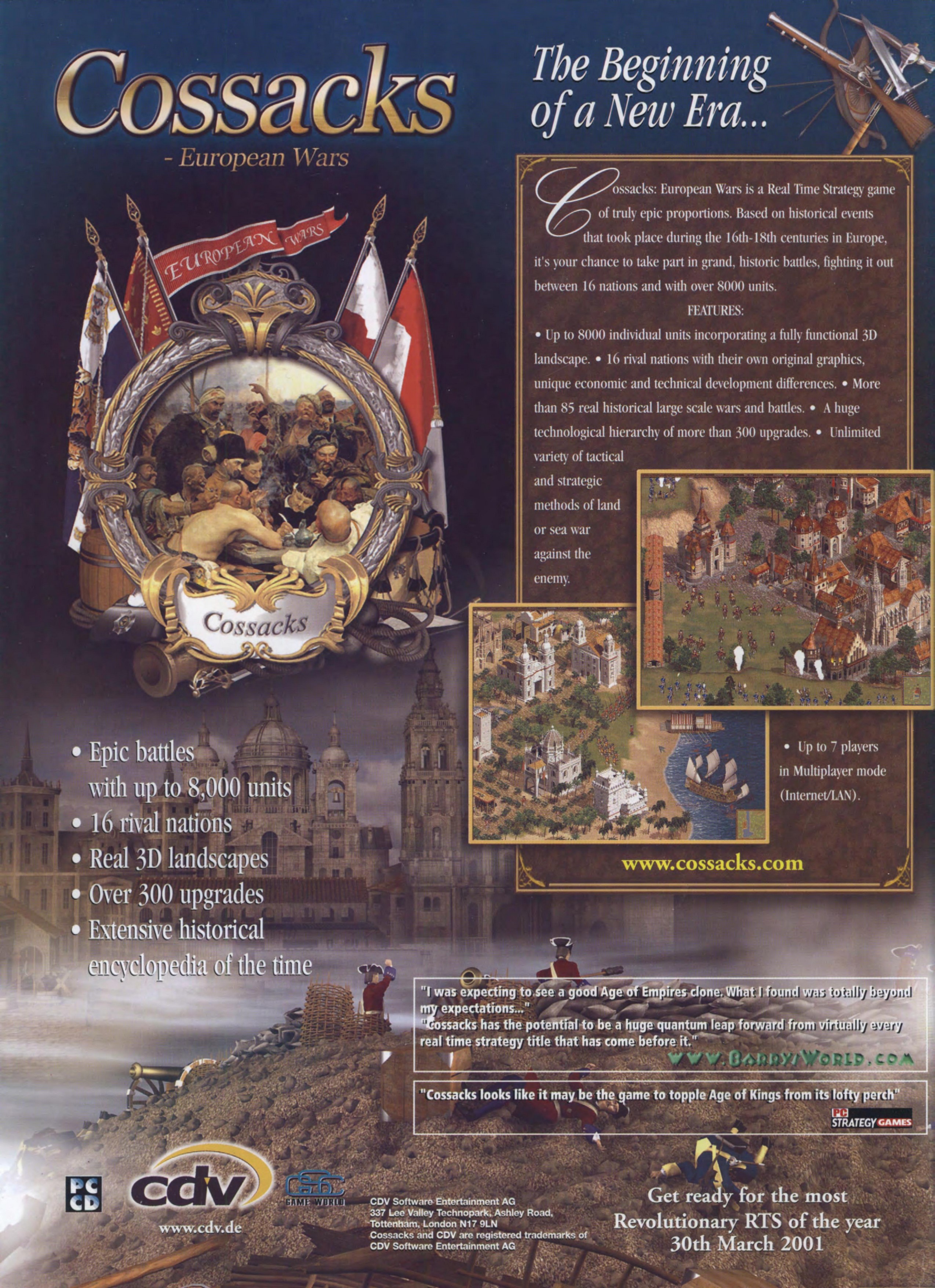 Ways that Cossacks surpasses the standard: - Peasants, buildings and artillery can be captured. Buildings can be captured and either used or destroyed. Destruction of buildings doesn't happen instantly. Once you press the Delete button, the building catches fire and then slowly burns away its hit points, adding -- for those destruction fans out there -- atmosphere as your forces cut a swath through a nation. However, this also gives the original owner time to restore the building if he or she manages to recapture it. The owner can apply peasant power to rebuild a building. - Officers, drummers and formations. Create an officer and a drummer in your barracks and group your infantry into formations, then control them by clicking the officer, who serves as the conduit for all movement orders for the soldiers who are part of that formation. This introduces realistic period maneuvering that resembles true formation tactics and drill. There are only three formations, however -- rank, column and square (columns not for fast marching, but as an attack formation.) The fine points of drill are not left to the player ("Wheel left!") but the effect is the same -- magnificent uniformed masses marching and sweeping the field. Inexplicably, formations can be made using groups of certain numbers that seem to have no discernible pattern or relevance -- 15, 36, 96, 120. Formations can only be made in the designated denominations. So for instance, if you have 14 Janissaries, you can't form them up until you make one more. If you have between 17 and 35 of them, you'll be able to make one formation of 15 and the others will go unorganized. The leftovers can be thought of as replacements, perhaps. (Hint: work these odd units into the formation after it has taken losses by moving them close to it, disbanding the formation and then re-forming it.) - The economy is more important in that gold must be spent to maintain units. The concept of supply is introduced (though not that of supply lines) in that you must have iron and coal (representing the manufacturing of shot and powder) stockpiled in order for muskets and cannon to shoot. If your stock of these materials is exhausted, your forces may become helpless in the face of the enemy. - Mercenaries are expensive to maintain but quick to create in a pinch. Your diplomatic center can provide bought-and-paid-for units that will work for you as long as your gold supply holds out. - Resources do not run out. Though this may not be realistic for such items as coal or gold, this is more game practical in that these resources are, to an extent, an abstraction representing many other resources of fuel and metals. More appreciated is the fact that the wood is not exhausted. Trees grow back. Also, building the mill automatically provides many self-replenishing amber waves of grain for food (you still must assign peasants to work them), visually adding to the game and saving the player the need to rebuild farms.
