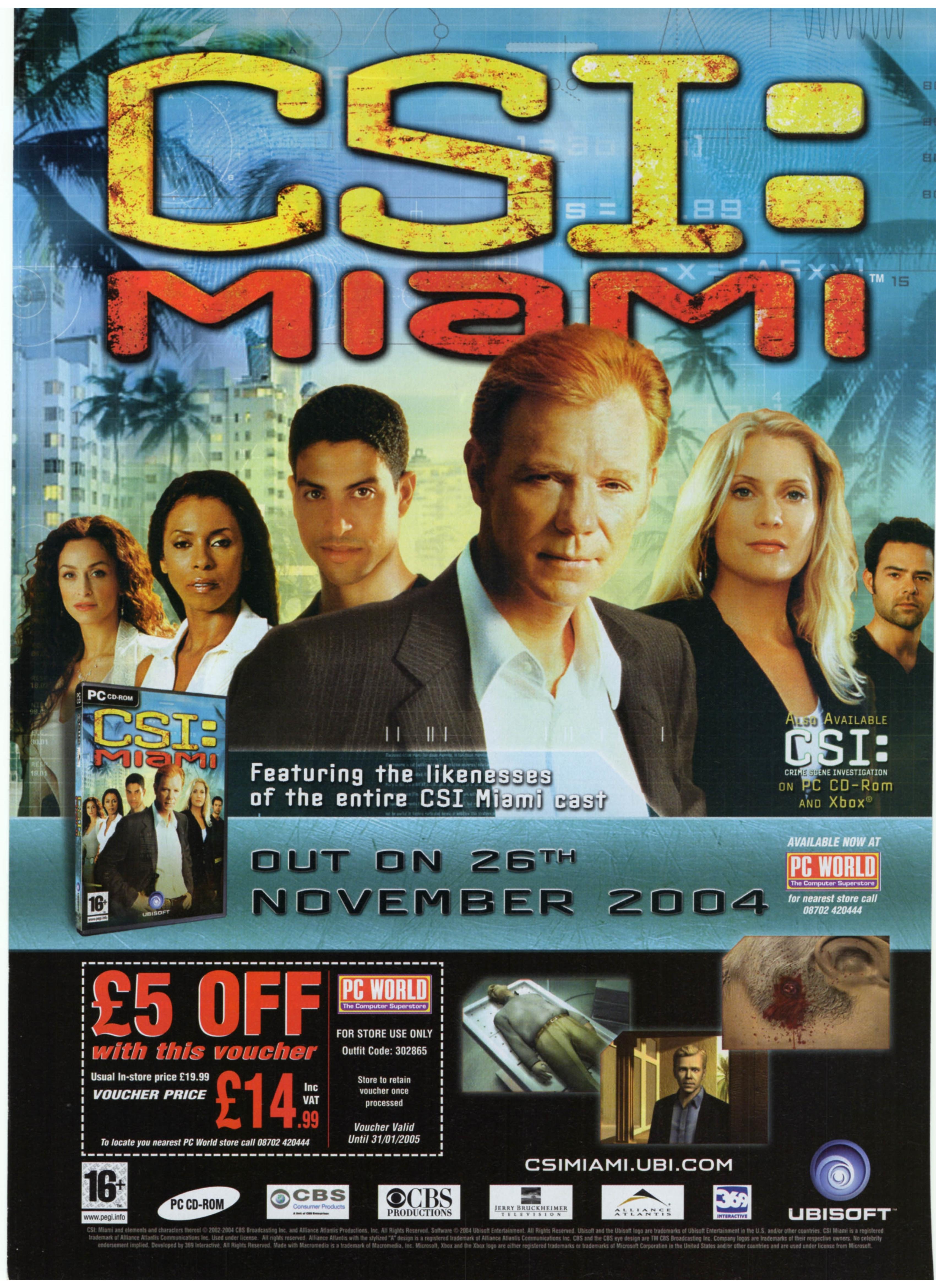 CSI: Miami is a show where a bunch of struggling actors solve crimes across South Florida with a mixture of old-fashioned detective work and newfangled forensics. Which initially leads to some interesting gaming. There's no action, and instead you visit locations to talk to suspects and gather evidence. Notice a suspicious looking substance on the corpse's trousers? Take a swab. Looking for fingerprints? Spray some Ninhydrin around the place.