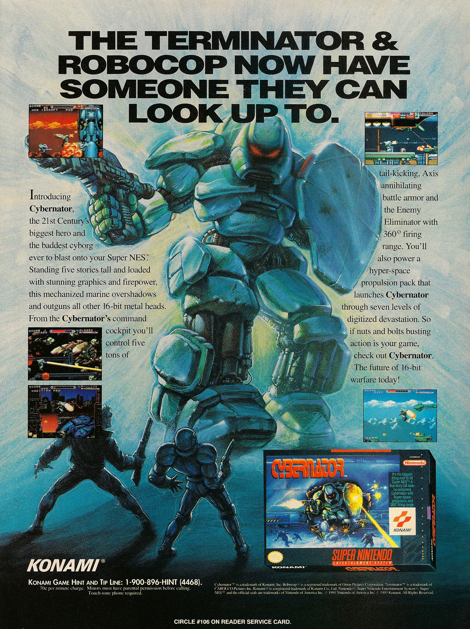 Cybernator by Konami is a side-scrolling, one- or two-player action/shooter that you're gonna have to see to believe. It sports incredibly hot game play for the SNES with cool graphic detail, gorgeous animated backgrounds, and bigger-than-life explosive action.