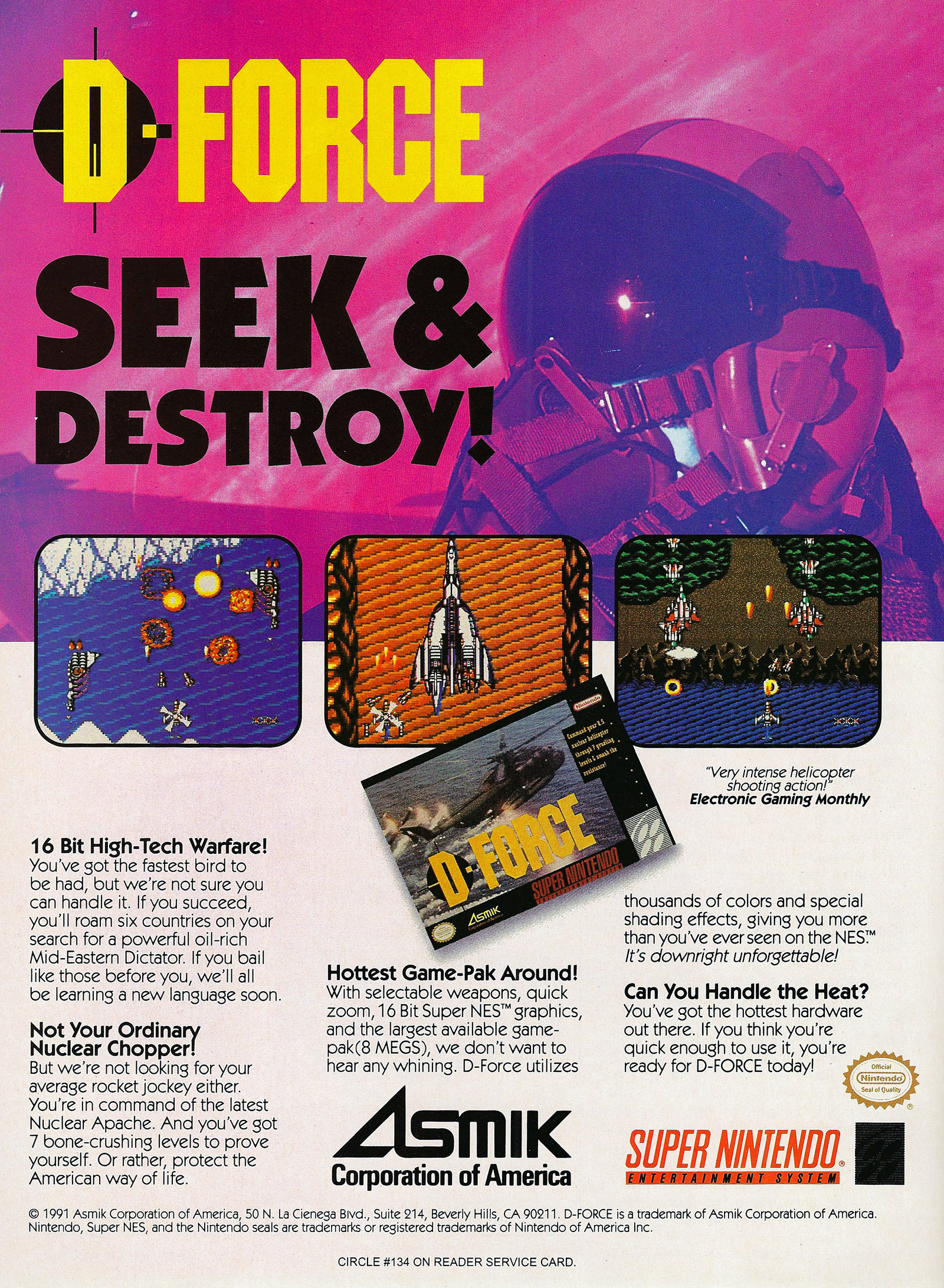 The use of the Super NES's special mode 7 has yet to be used as well as it is in Asmik's new D-Force! In D-Force you guide a specially designed heli through relentless levels of attacking warships, monsters and even dinosaurs! You even operate in three dimensions with control over your altitude as well as your position on the screen during battle!