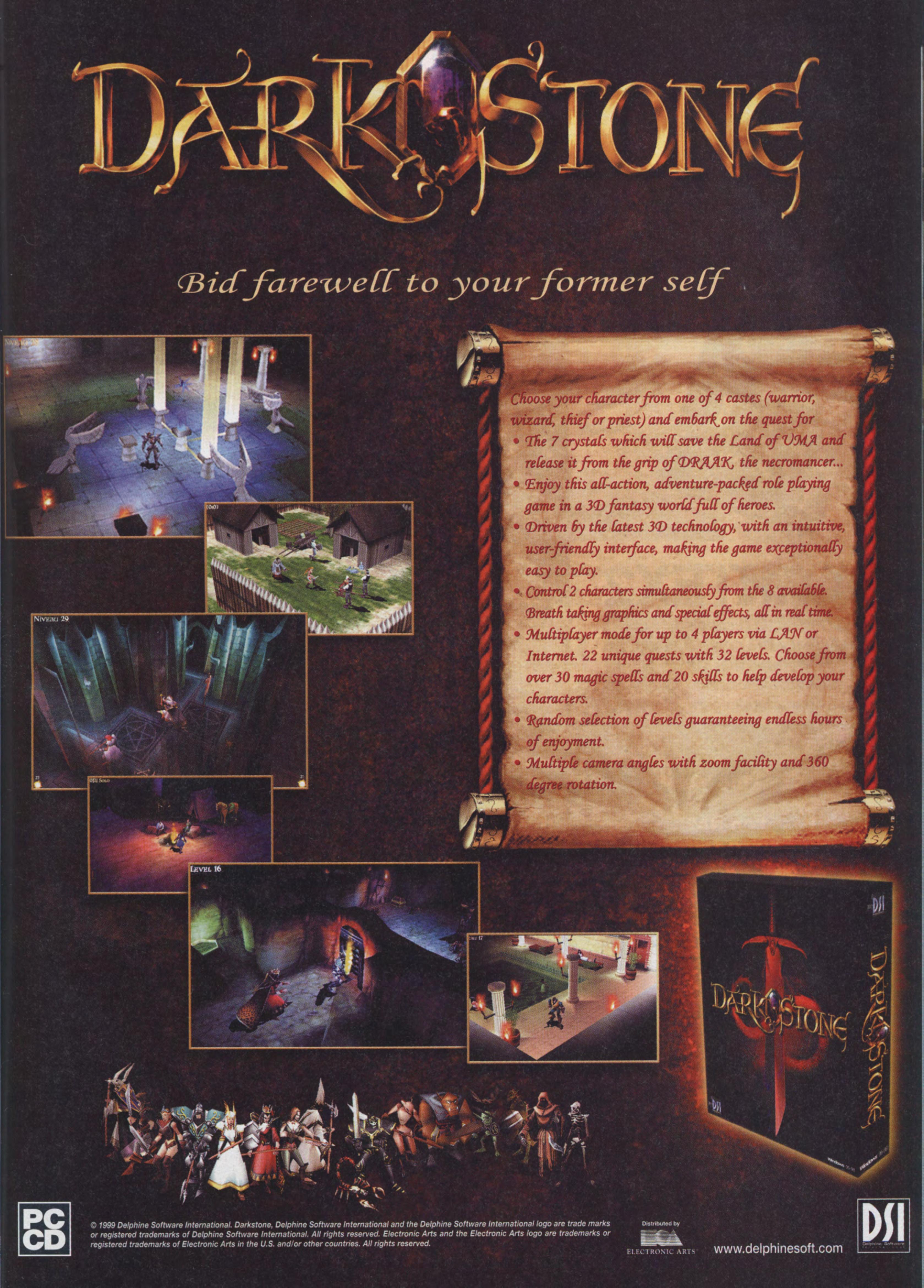 Thanks to a highly intuitive control system, Darkstone allows you to control two characters simultaneously and share their inventory, while still offering the hands-on combat of Diablo. Phenomenal light sourcing, impressive dungeon design, and a plethora of complicated puzzle quests could make Dark-stone a viable challenger to Blizzard's franchise.
