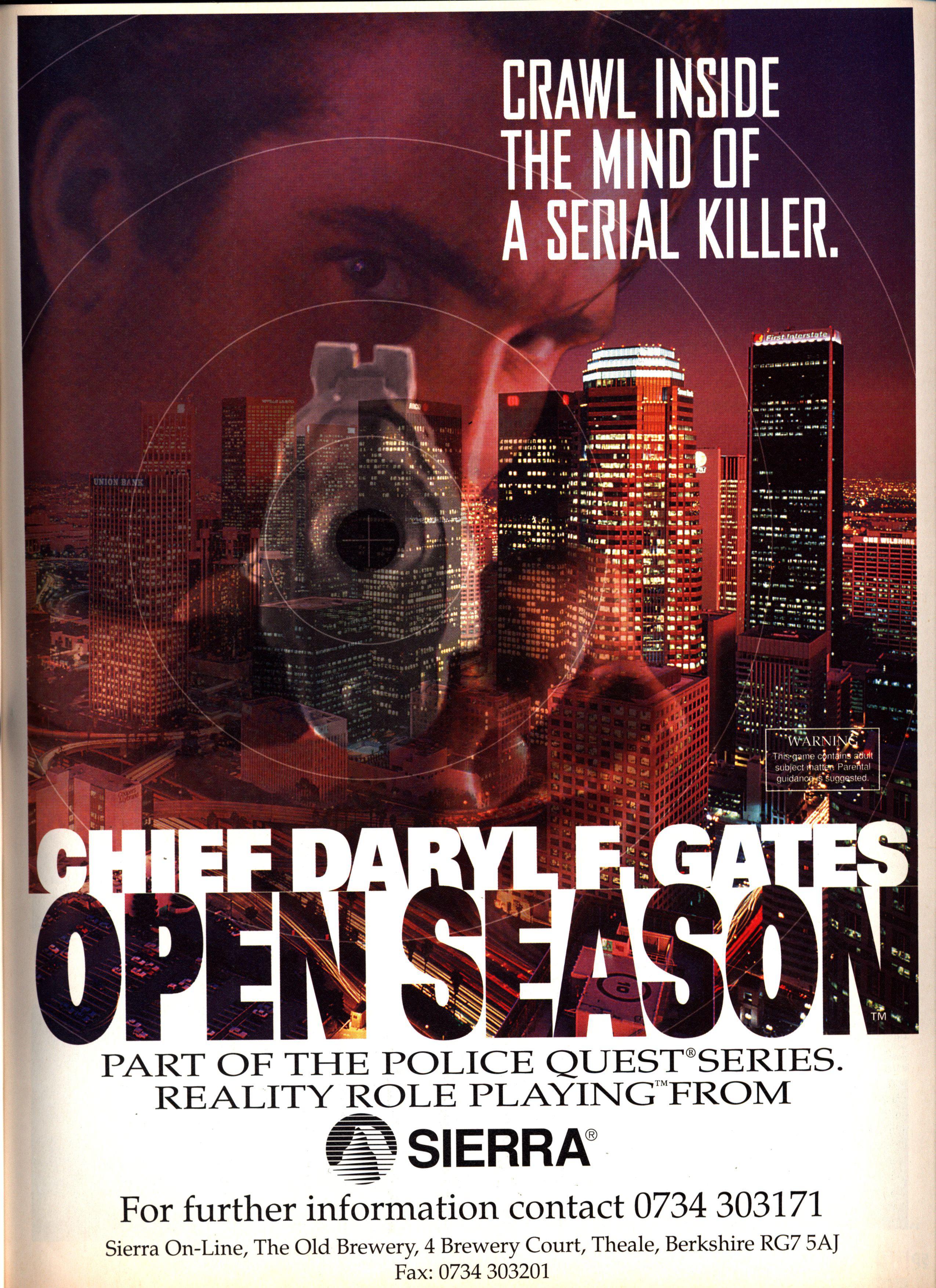 Open Season has a different author from the previous Police Quest games, and he is one Daryl F. Gates. Sound like a teenage whizzkid programmer? Er, not quite, as he's a retired Los Angeles Police Chief who spent 43 years in the force, taking command of 8,000 officers in the 486 square miles of la, working on the Charles Manson murders amongst other gruesome tasks.