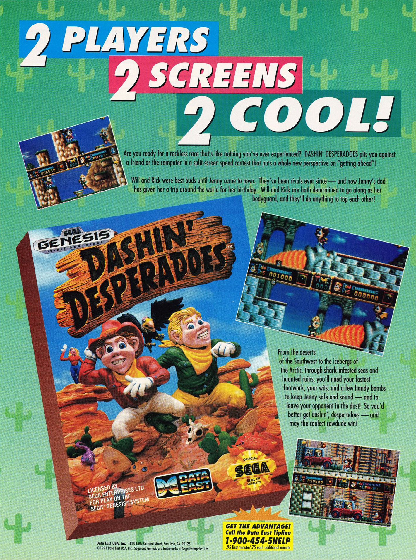 Dashin' Desperadoes is a frenetic split-screen game that's filled with cowboy crunchin' mayhem. You play Will in a mad dash against a friend (either real or computerized across six worlds with three stages apiece). You run, dash, jump, throw bombs and stomp across the terrain, all while trying to beat your partner to Jenny, who's waiting for you at the end of each stage. In the third stage you have to beat a nefarious machine by throwing bombs and avoiding anything thrown at you.