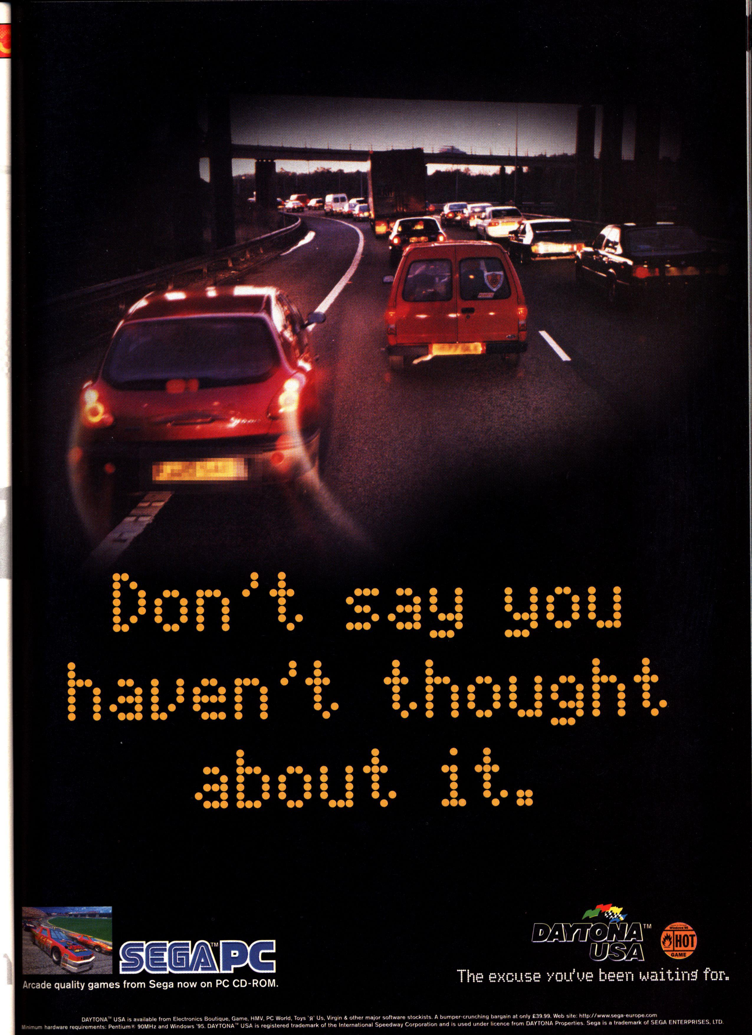 Sega have very cleverly taken a shite Saturn game and made it worse for the pc. The cars handle almost exactly as uselessly, but as for the frame rate... well, let's just say forget about it. And that was on a P166, by the way. What you get is jerk, jerk, jerk, jerk, jerk, and then a long pause as scenery loads in (or something). Then it's back to jerk, jerk, jerk again. It gets to the point that when hacking down a long straight you actually encounter the Cwagon wheel effect' from cowboy movies: the dotted lines on the road appear to be going backwards, even though the scenery beyond is nearing. Bizarre. And, of course, very, very crap.