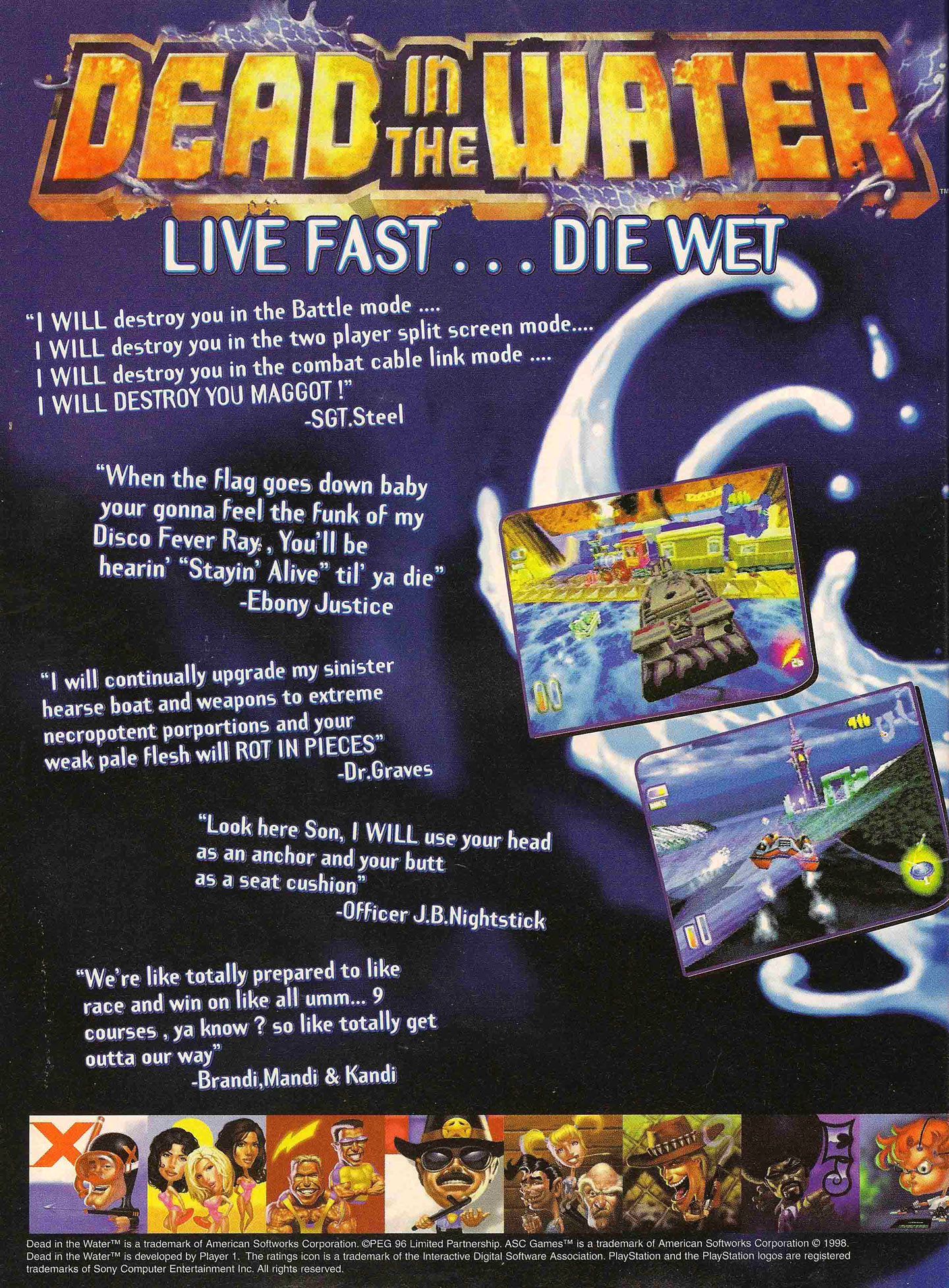 This game earns style points for letting you launch weapons into the arena grandstands and blast screaming spectators from their seats, but otherwise Dead in the Water is a shoddy clone of the Twisted Metal games. The rolling water looks nice (well, at least up close; we've got some major drawin problems here), but the waves really throw off your control. The Racing Mode is a bit more fun than Battle, but not much.