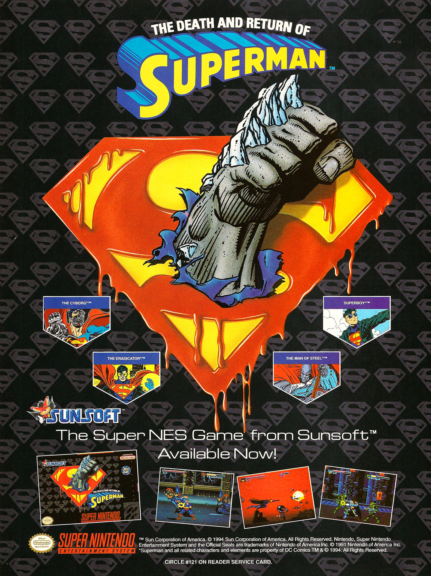 Тогда на помощь пришли разработчики компьютерных игр из компании Blizzard Entertainment и создали платформер в стиле beat 'em up под названием The Death and Return of Superman. По сюжету здесь объявились целых 5 приемников громкого титула Супермена, каждый со своей историей и способностями. Сражаться они могут не только с нарушителями, но и друг с другом.