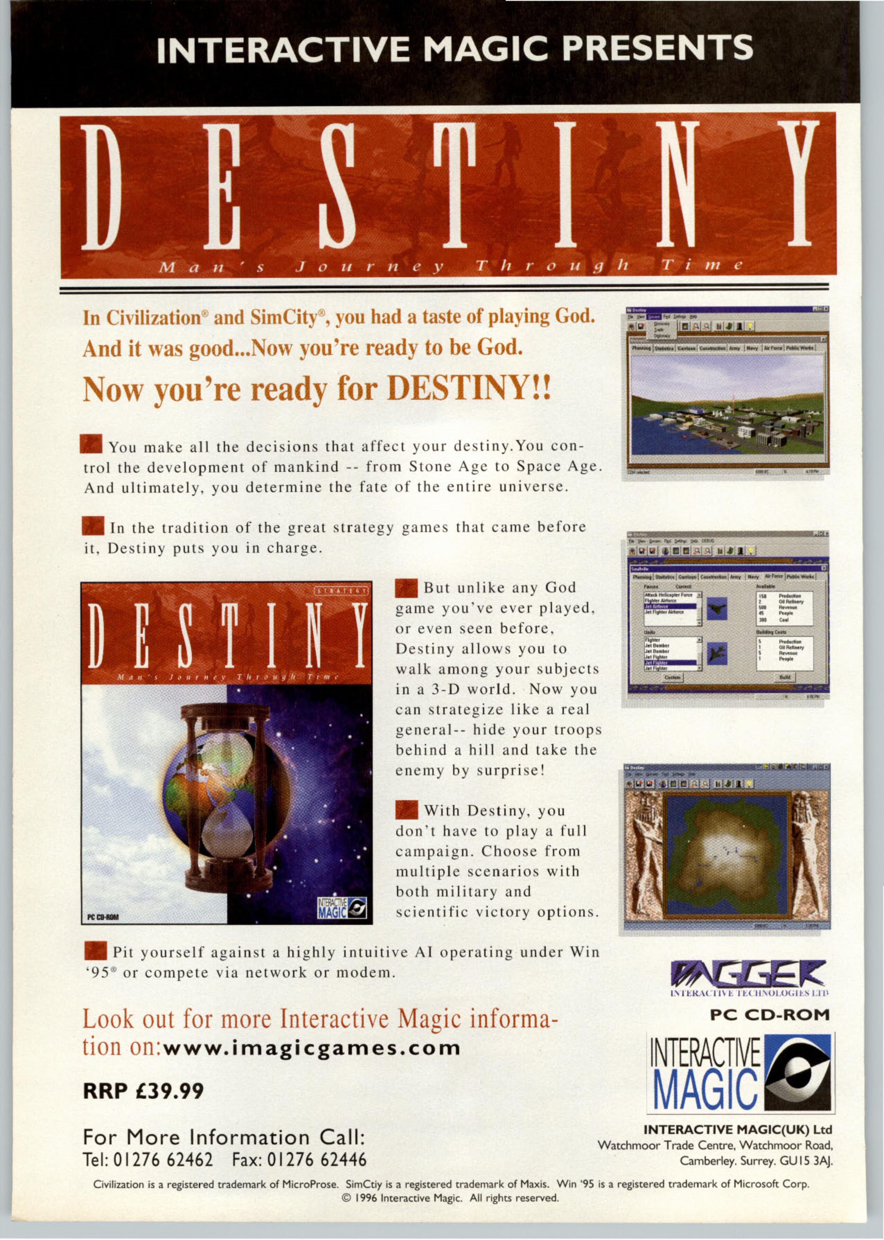 With its superior multiplayer support, Destiny is in position to become the game of choice for fans of Civ-type strategy who want the ability to play against live opponents. But until Interactive Magic has released more patches to take care of the game's many defects, playing Destiny is more frustrating than fun. I give Destiny 48 out of 100.