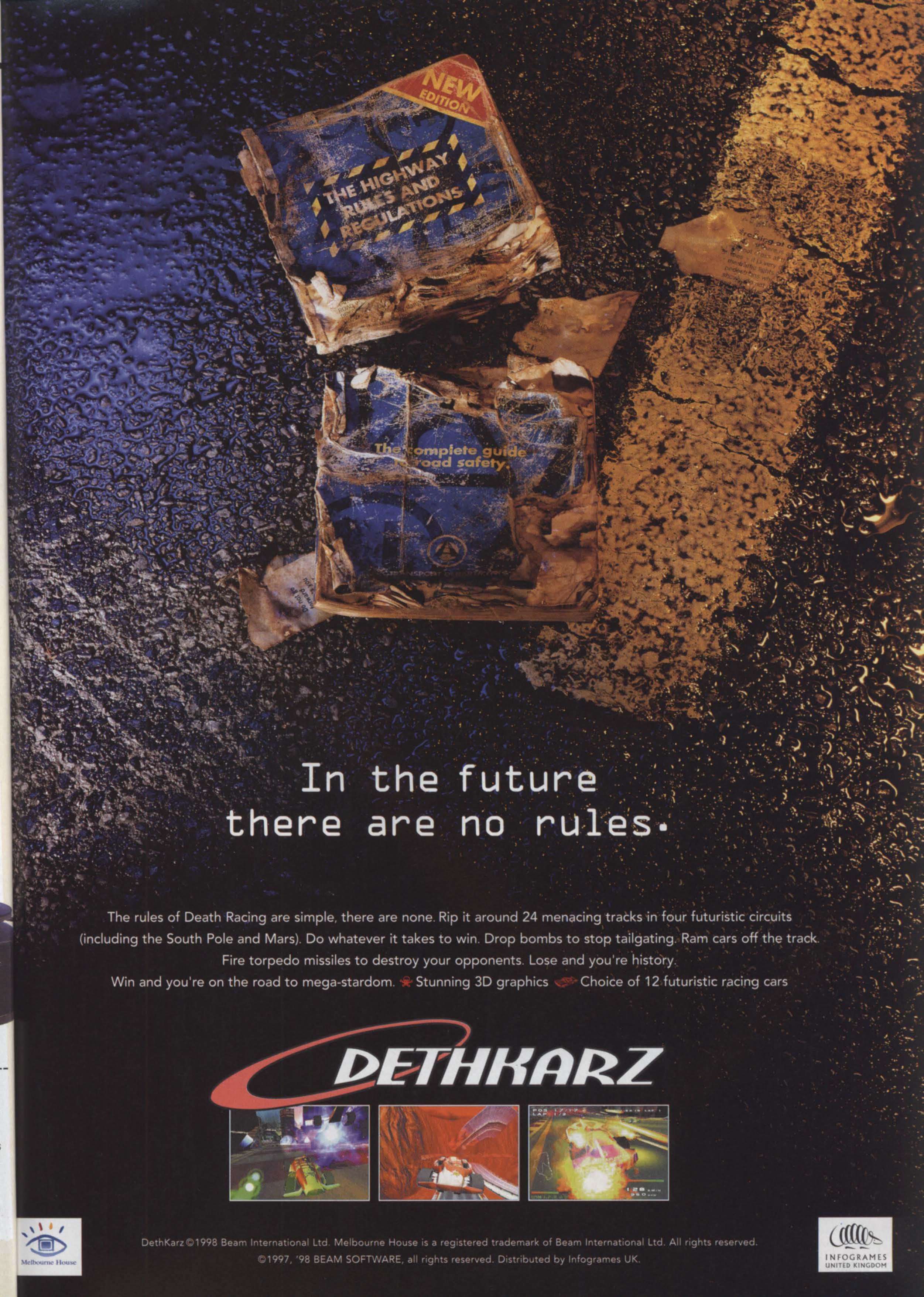DethKarz does futuristic racing right--it's sort of Grand Prix Legends meets Wipeout. Openwheeled cars slide around 12 tracks, grabbing offensive power-ups along the way. Since every car's equipped with a plasma cannon, nobody will dare call you a sore loser. Visually, DK already packs a punch, with moody Blade Runner-style cities as well as one track made of ice and another one on Mars. In the beta version we played, you could choose from only a handful of cars, and there was some noticeable draw-in on the horizon. If those elements can be straightened out, DethKarz might find a loyal following.