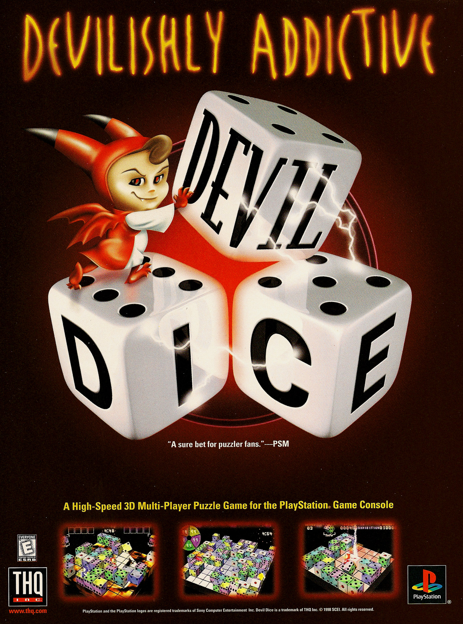 Ever close your eyes to sleep, and still see Tetris blocks rotating and falling beneath your eyelids? Welcome to the next addicting puzzle game that will have you up at night playing and advance you to the next level in the Procrastinator's Hall of Fame. This game was originally named XI and developed by Sony Computer Entertainment Inc.; it was then picked up by THQ and renamed Devil Dice due to its "devilishly addictive" gameplay.