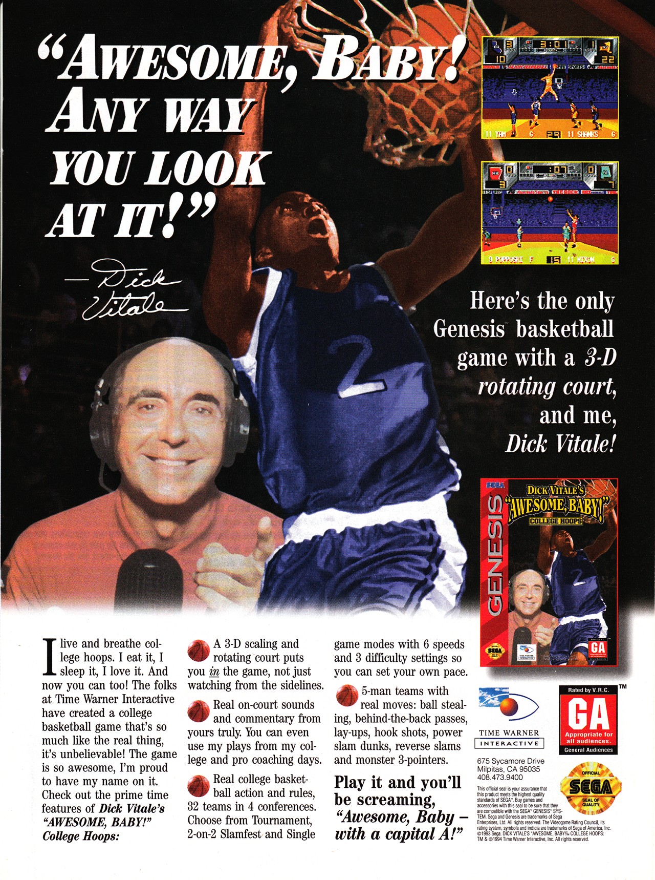 Compared to 1994's other basketball games, Dick Vitale's fun new Genesis game is unique. It would be considered a breakthrough, if not for its resemblance to NCAA Basketball. Unfortunately for the ESPN analyst, his new game doesn't quite reach the lofty standards of NCAA, which ranks as one of the best hoops games ever.