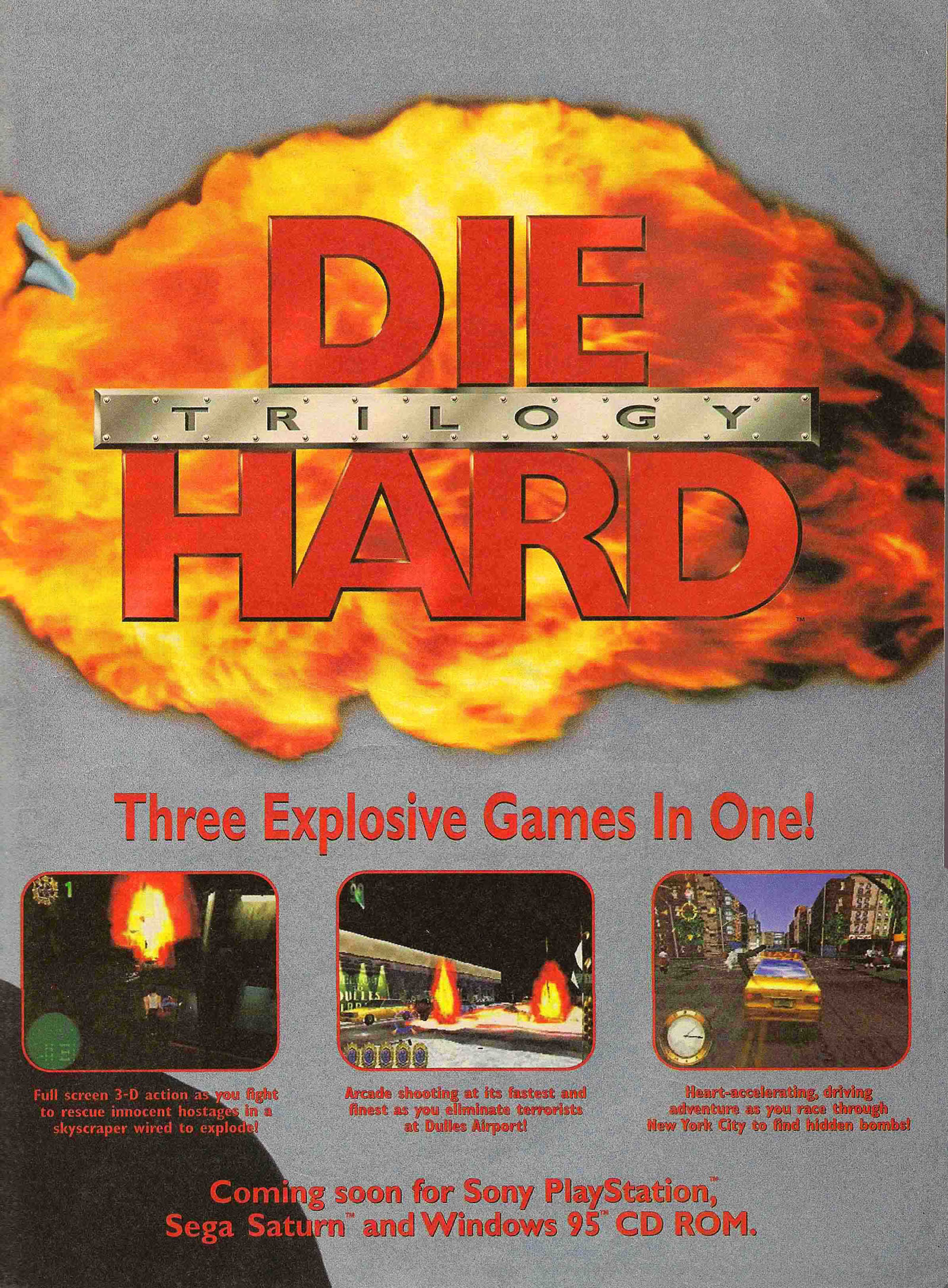 Die Hard Trilogy is a compilation of three games loosely based on each of the movies. All three games are completely different but have the same goal in mind -- save the hostages and the people from the terrorists. Die Hard Trilogy packs three excellent games into one $50 package, and game players everywhere are the real winners.