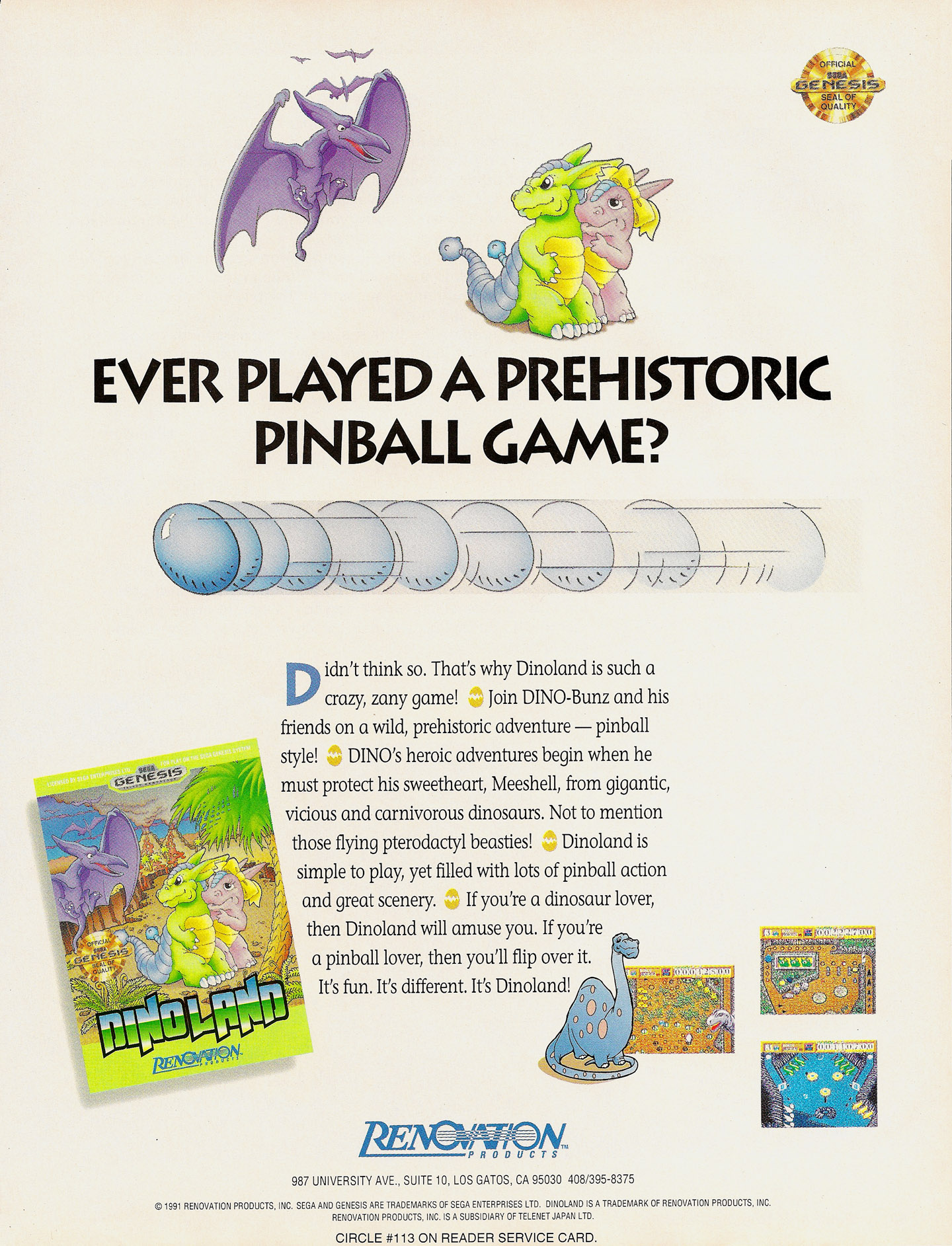 The first Genesis multi-field pinball adventure is on its way! Can you feel the inertia shift when the catapult launches the glittery pinball into the play area? If not, then you haven't been playing! Dino Land has multiple-scrolling play screens, different pinball setups, and hidden bonus rounds! Change the difficulty setting to adjust the effects of gravity on the ball. Send a red hot ball blazing into a Tyrannosaurus' mouth! To really skyrocket the score, shoot the pinball into the slot machine for a mystery bonus. The terrain gets tougher as the points progress, so keep on your toes! Roaming dinosaurs litter the screen in a vain attempt to slow or stop your ball. Grab the bonus icons as they appear for super point awards! Everything you love about pinball is waiting in Dino Land, with a few extras to boot!