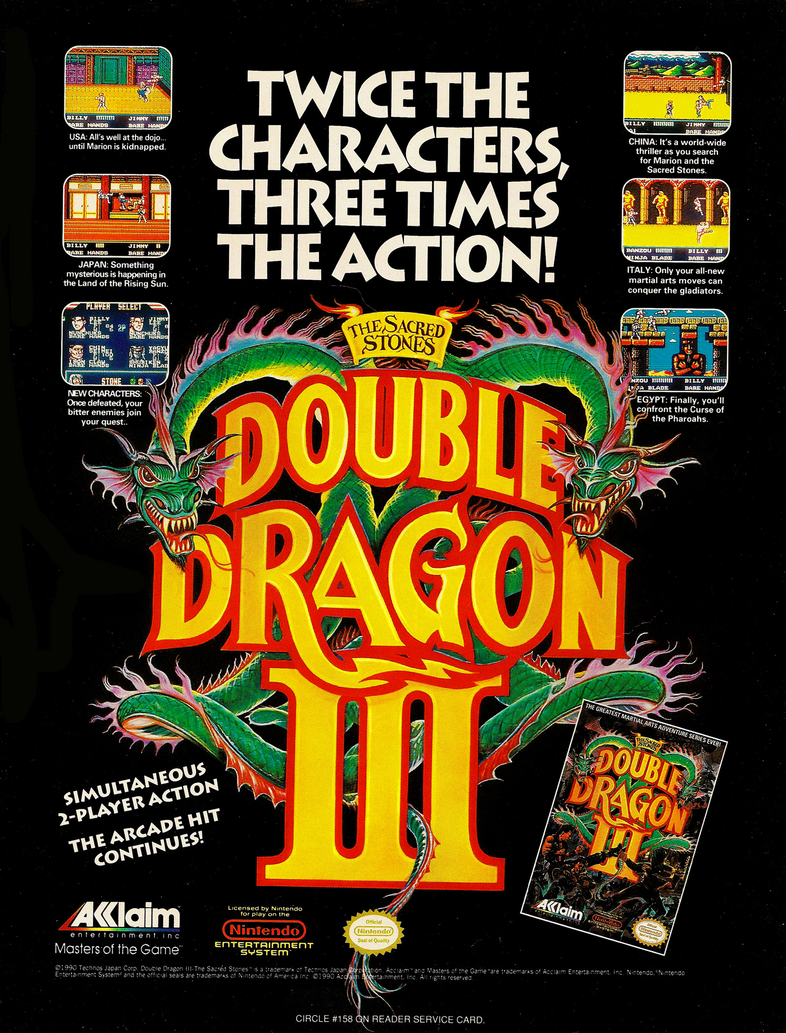 In the third installment ol the popular Double Dragon trilogy for your NES, Billy and Jimmy Lee must travel the world in search of not only Marion, but the mysterious and powerful Sacred Stones as well! Complete with great new graphics, moves, and action, Double Dragon III sends our martial arts heroes around the globe, featuring some of the most deadly opponents yet! Warriors Chin and Ranzou, however, join your quest when bested and add to the selection of moves you can use against the enemy! All the mystery and excitement of the first two games multiplied times three!
