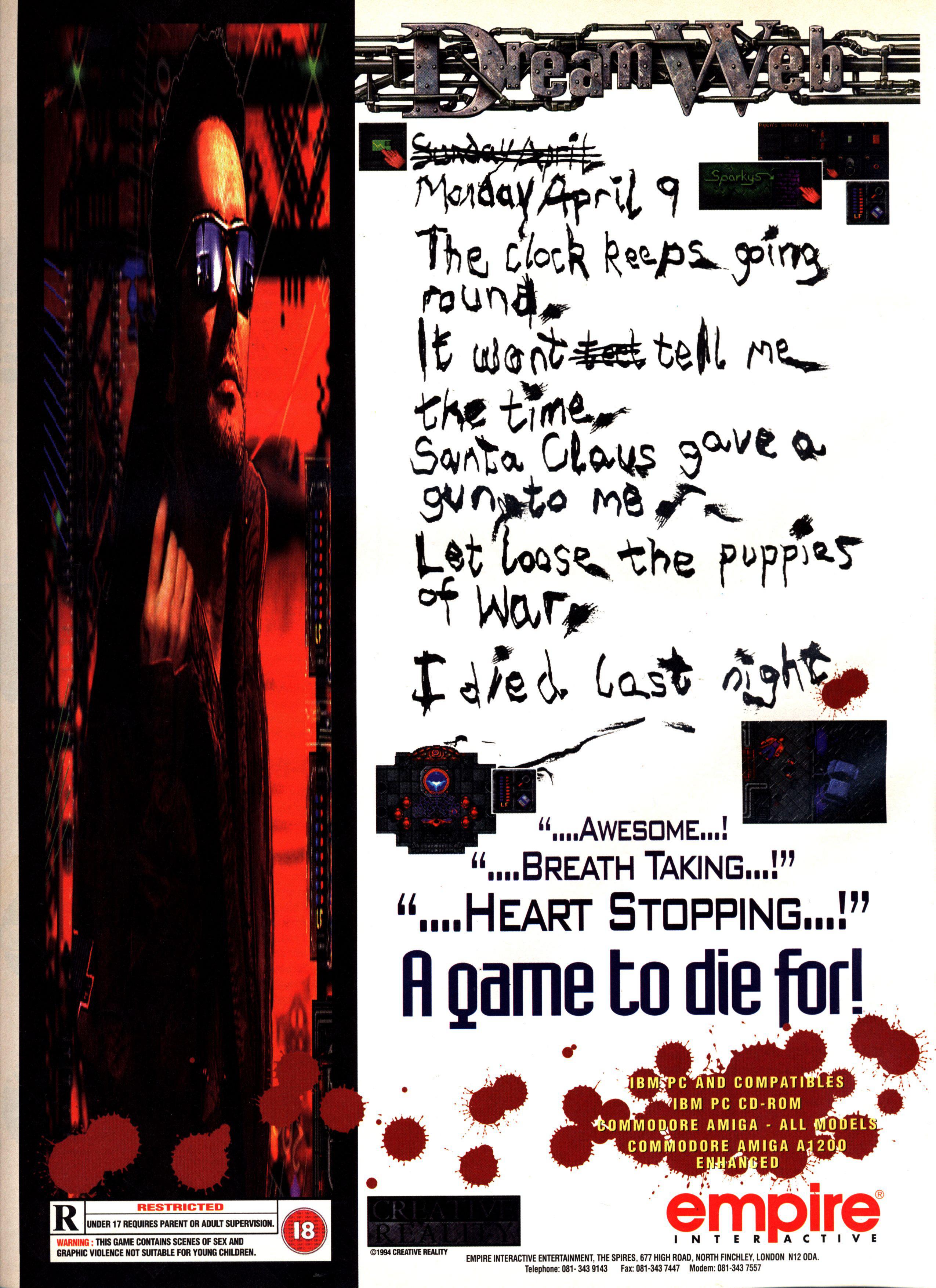 I finished Dreamwcb in two days. Not two days of solid play, but two days of casual attachment. Normally, I'm useless at point-and-click adventures (I never finished Monkey Island 2, for example), but I found Dreamweb a total walkover. The puzzles are far too simple: the few places you'll get stuck can usually be solved by either a) scouring the accompanying "novella" for clues, or b) about two minutes of mild thought. This all adds up to a confusing situation: Dreamweb's low level of difficulty would make it ideal for younger players... if, that is, it wasn't bursting at the seams with graphic sex and violence. Hnnnm. It's a crying shame. It reminded me of an After Eight Mint - dark, delicious, and satisfyingly bad for you, but disposed of in seconds. I wanted more. Much more.